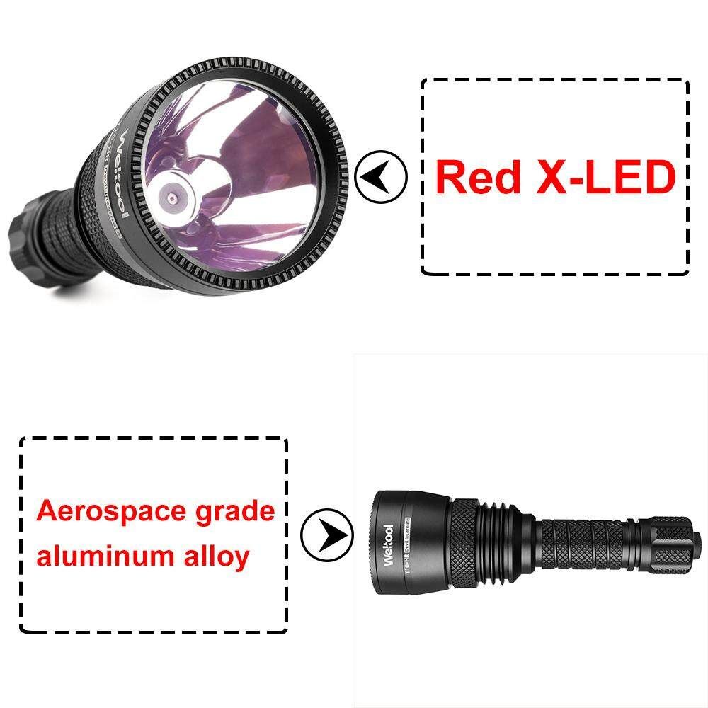 with anodized surface treatment Reflector Aluminum smooth mirrored reflector LED High efficiency compact RedX-LED, cooperating with separation copper MCPCB Output runtime Tested by Weltool UB18-35 Li-ion T10-HRRedLight Mode Low High Beacon Output 119LM 342LM N/A Candela 23000cd 50600cd N/A Beam distance 303m 450m N/A Runtime 4h29min 2h N/A Powered by 1 piece of 18650 3.7V Li-ion