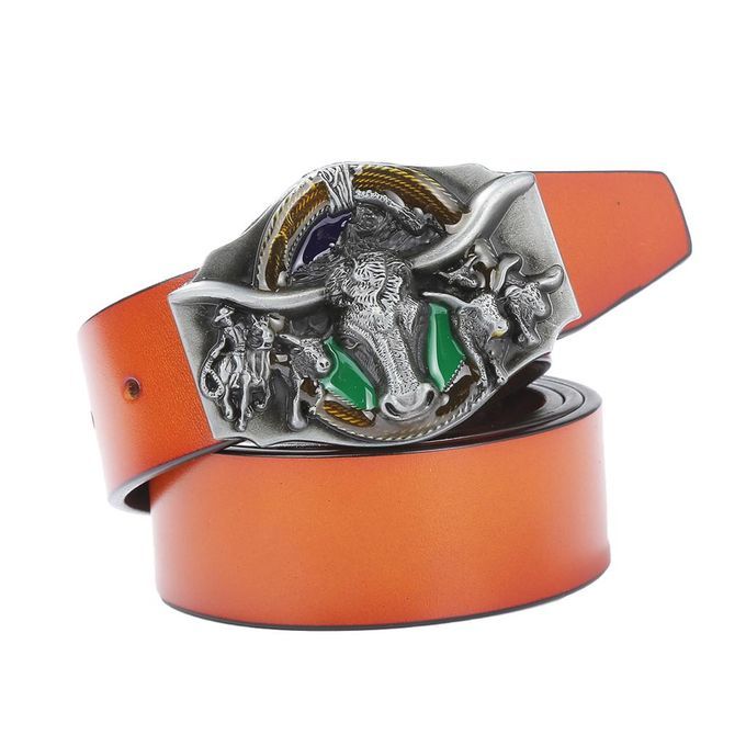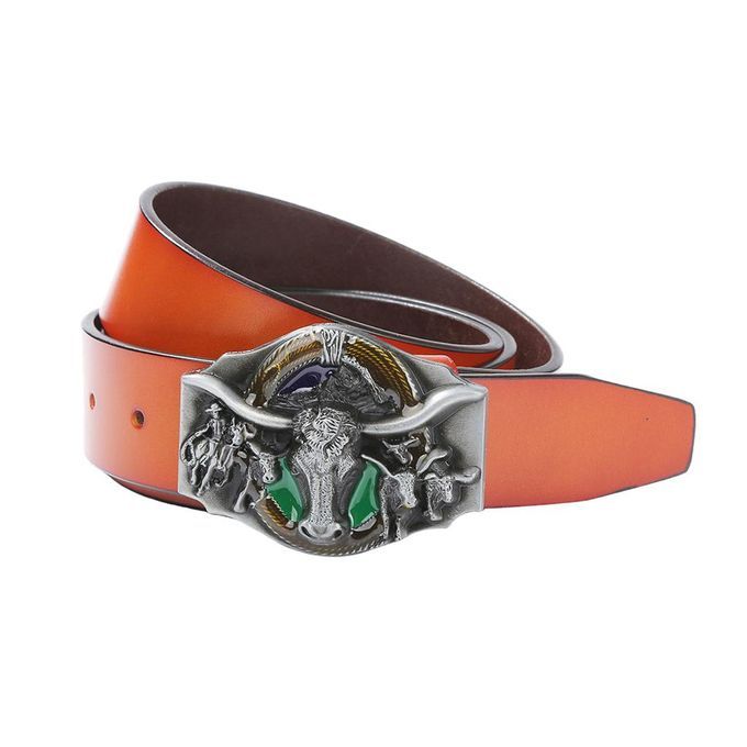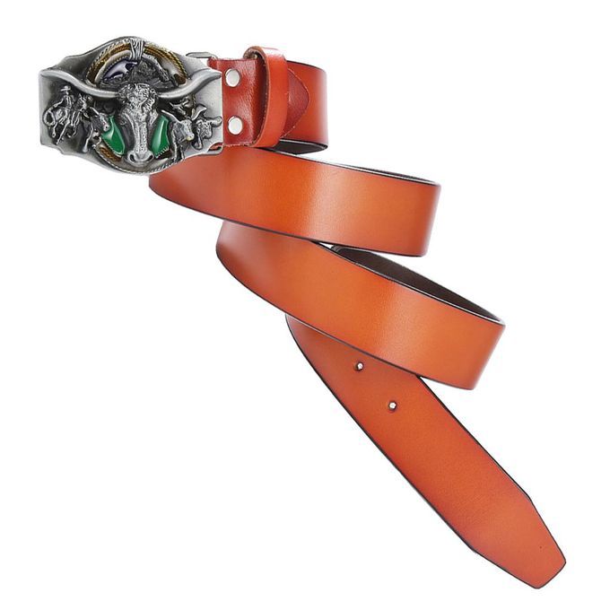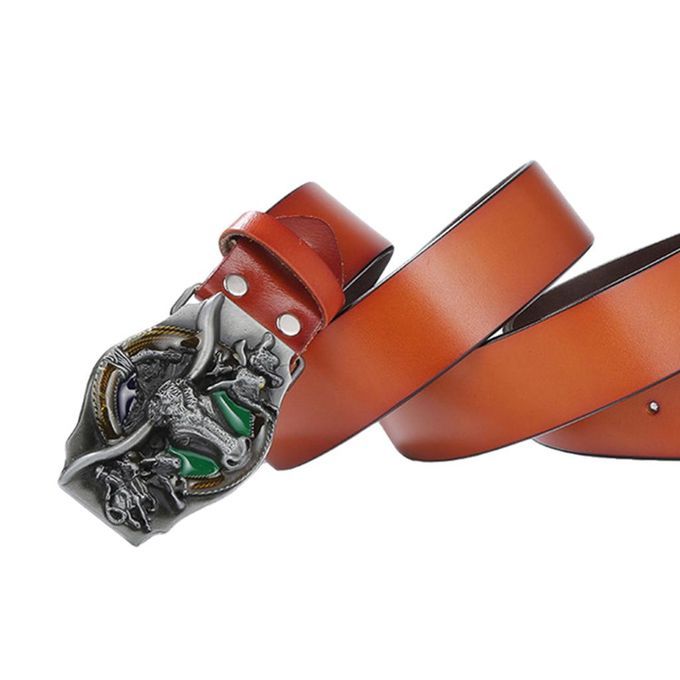 Vintage Style Leather Belt with large bull head engraved patterns belt buckle.