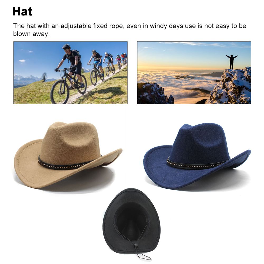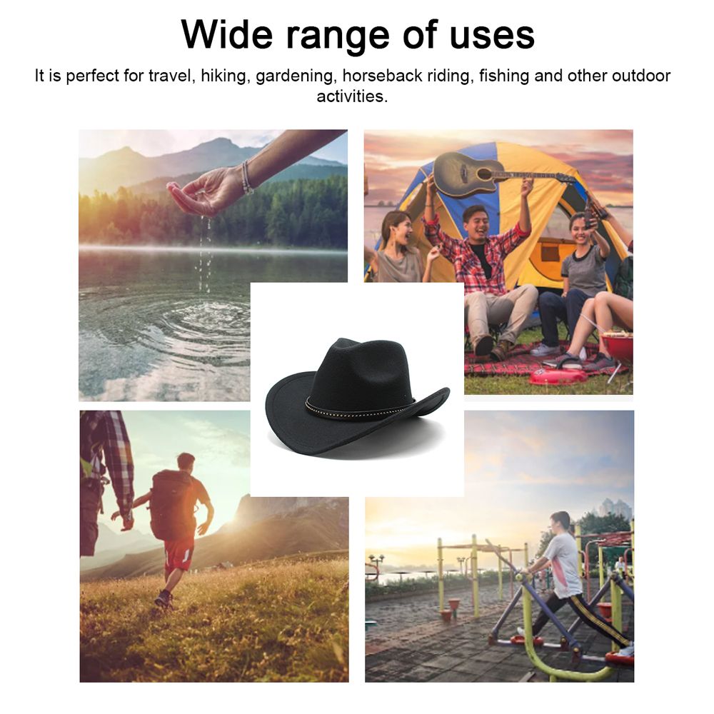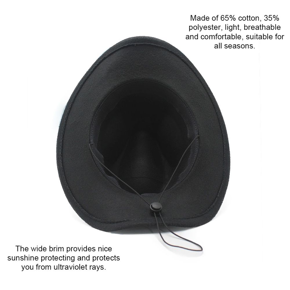 Stylish western cowboy hat is made of high-quality felt material, soft, comfortable and has nice durability. Wide brim provides nice sunshine protecting. With a fixed rope to ensure the safety of wearing. Universal for men and women, suitable for people with a heads circumference of 22.0-22.8in.