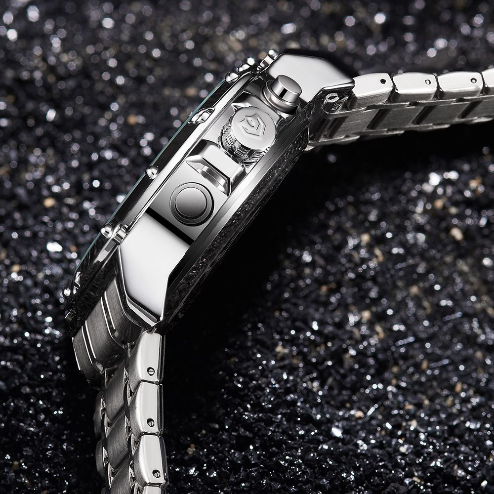 1.9in large case and stainless steel construction lends striking appeal to this modern men watch.