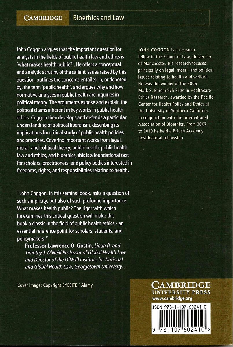 John Coggon argues that the important question for analysts in the fields of public health law and ethics is what makes health public?", He offers a conceptual and analytic scrutiny of the salient issues raised by this question, outlines the concepts entailed in, or denoted by, the term 'public health', and argues why and how normative analyses in public health are inquiries in political theory. The arguments expose and explain the political claims inherent in key works in public health ethics. Coggon then develops and defends a particular understanding of political liberalism, describing its implications for critical study of public health policies and practices. Covering important works from legal, moral, and political theory, public health, public health law and ethics, and bioethics, this is a foundational text for scholars, practi tioners, and policy bodies interested in freedoms, rights, and respon sibilities relating to health.