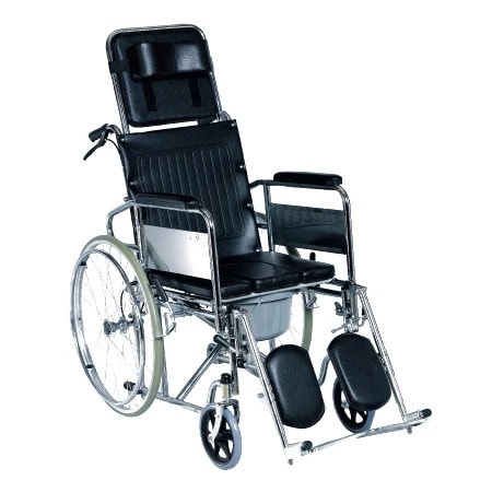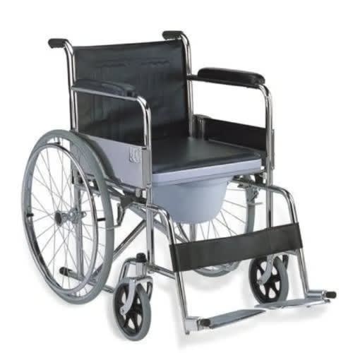andard Commode Wheelchair is a simple type of wheelchair with commode that can give you the independence on your mobility & other daily routines. The wheelchair has a self-contained & removable & plastic commode pail, or you can position the chair over a toilet. The chair comes with durable steel frame with powder coated finish. The chair comes with flip down armrests & detachable footrests. The padded upholstery is made of PU that is durable and comfortable. User propelling wheelchair with integral commode. Comprises stainless steel frame; front castors; rear wheels with lever brakes; rear tipping levers; individual swing away, detachable footplates; seat cushion with front cutaway; front loading commode pan; padded armrests and individual push handles.