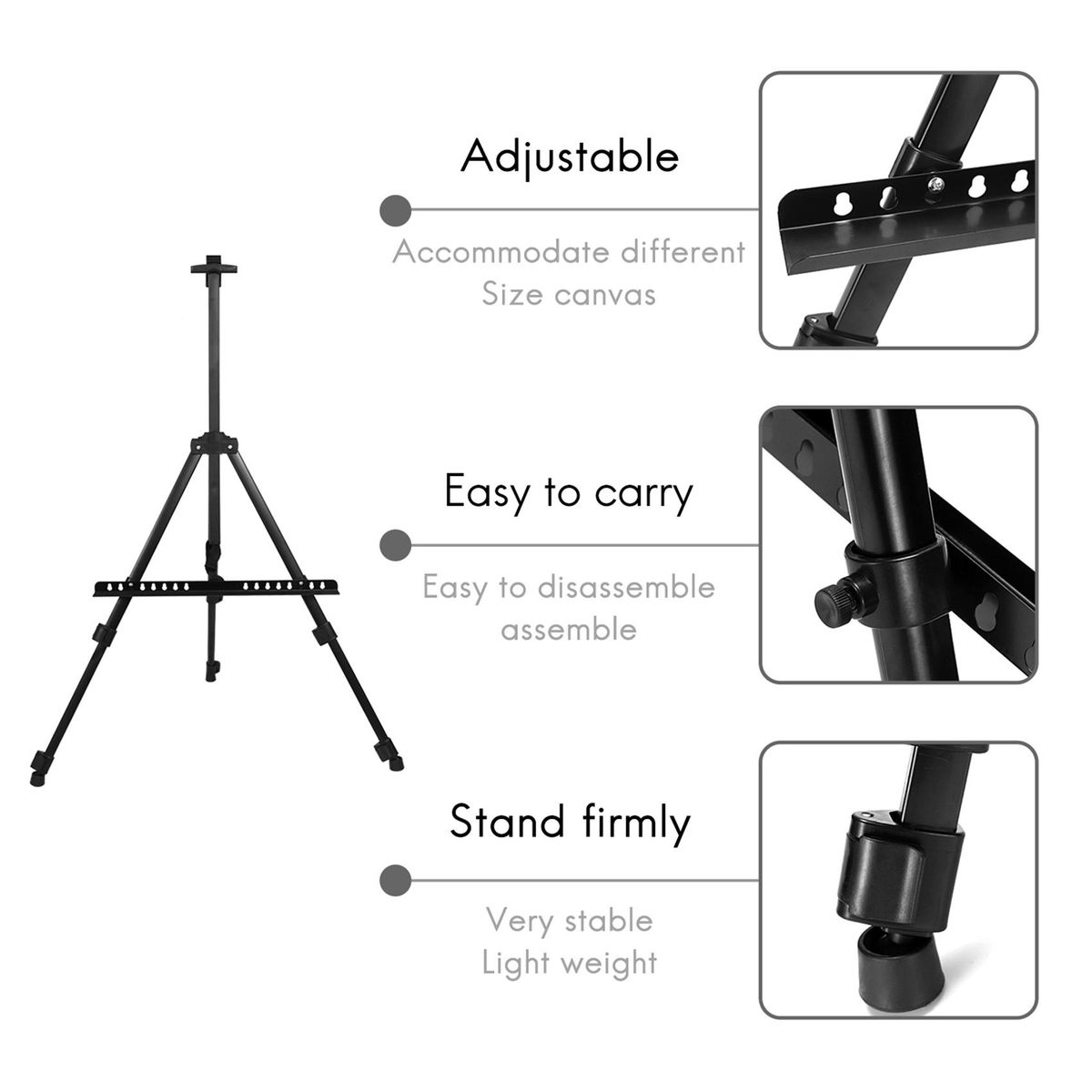 It can hold canvases with different sizes by adjusting the screw hole of the support Max canvas height 83cm