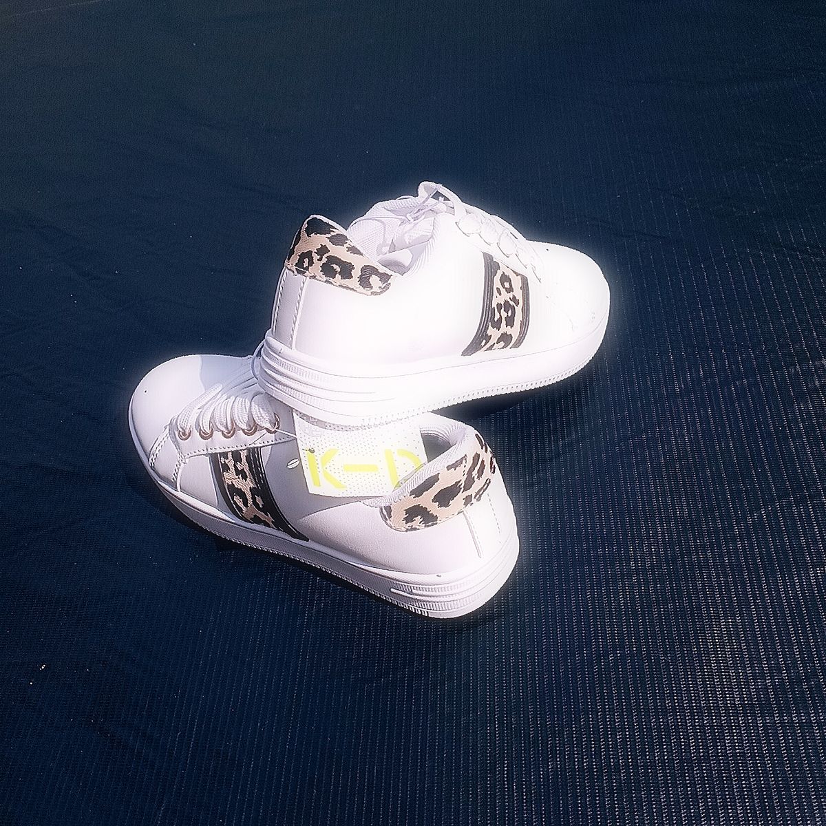The shoe is all-white. This includes the body, sole, and the laces. The body is the outcome of a delicate craft using white leather. It has some leopard skin designs sewn on the sides and the back using the same leather. These add even more elegance to this already outstanding work.