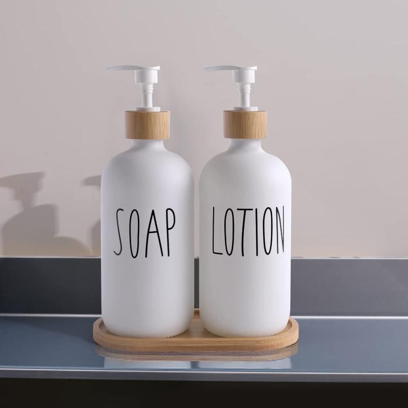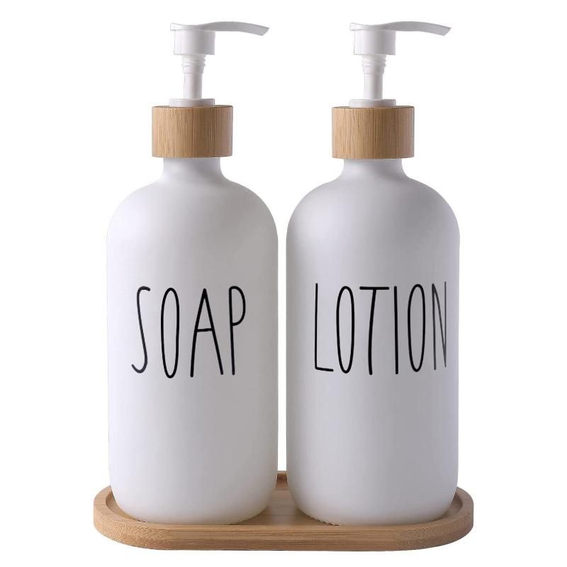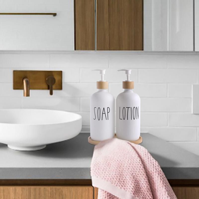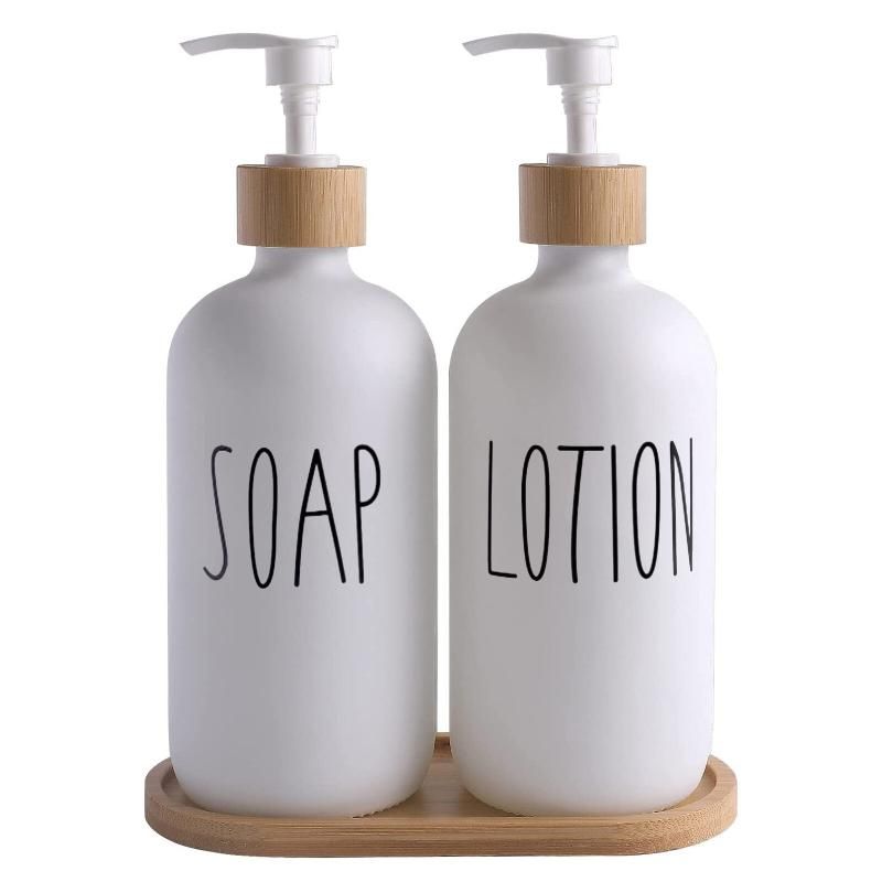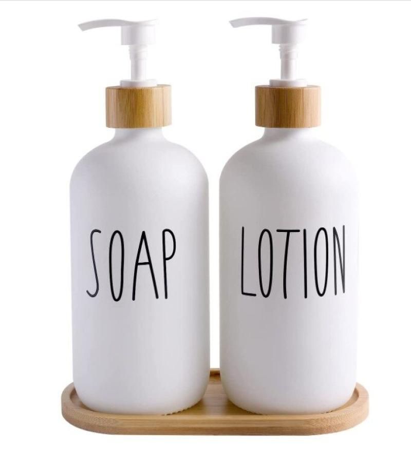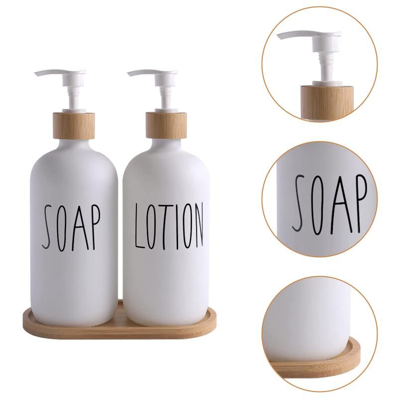 White Glass Soap and Lotion Dispenser Set: 500ml with Wooden