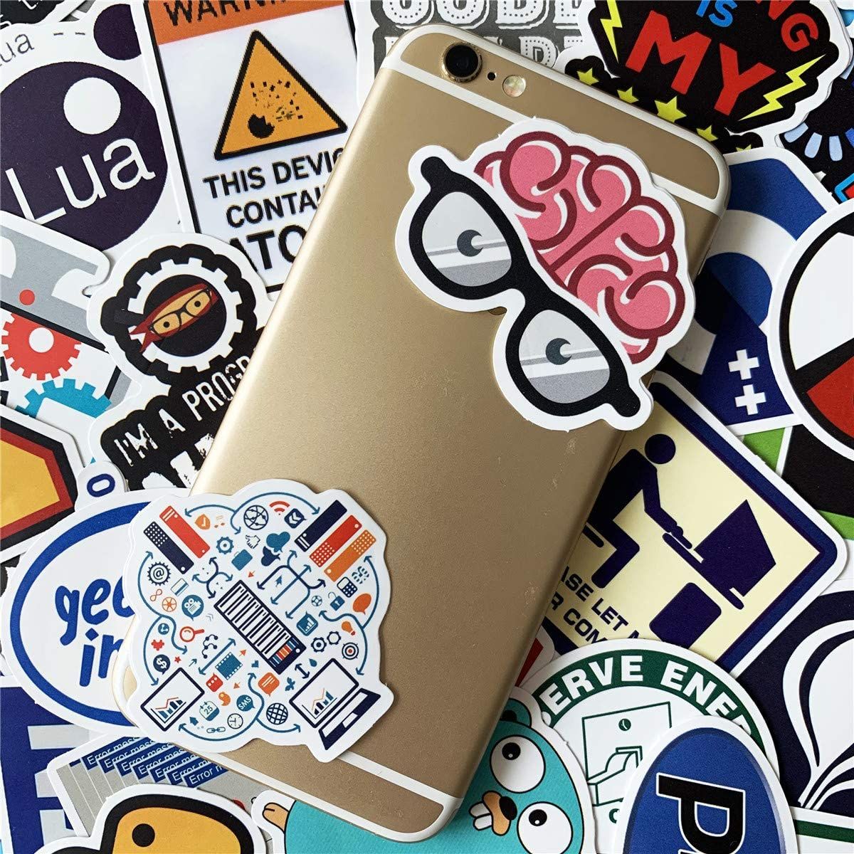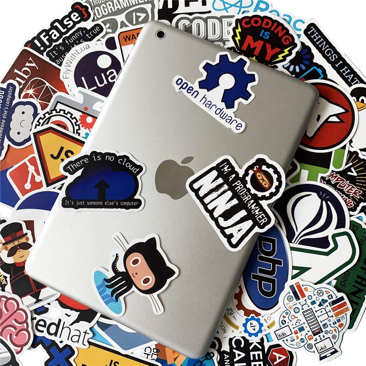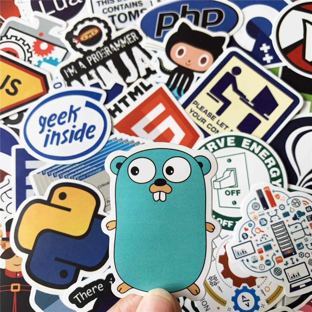 Package includes 50 pieces funny laptop stickers, such as C++, XML, Power Supply, NET, SQL, JAVA, React, Python, Bing, C#, Chrome, Docker, PHP, Swift, etc.