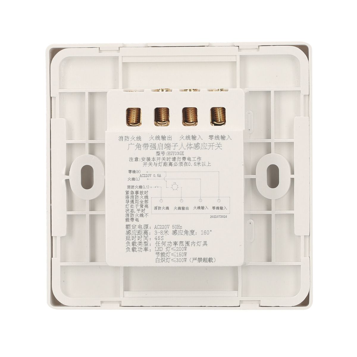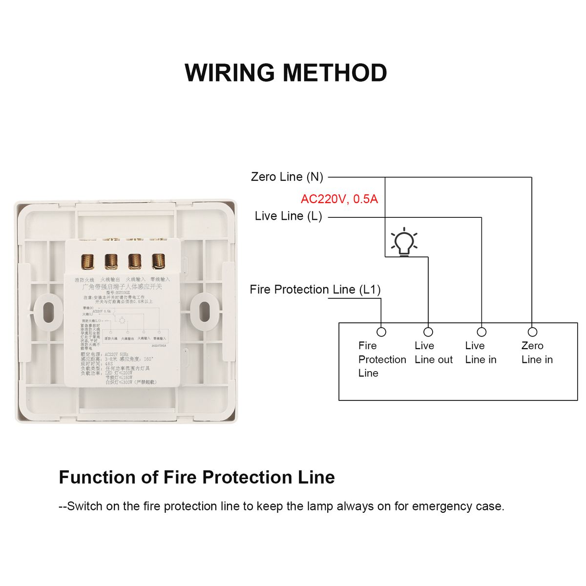 4 wiring terminals in the switch: fire protection line, live line in, live line out, zero line in. Switch on the fire protection line to keep the lamp always on for emergency case.