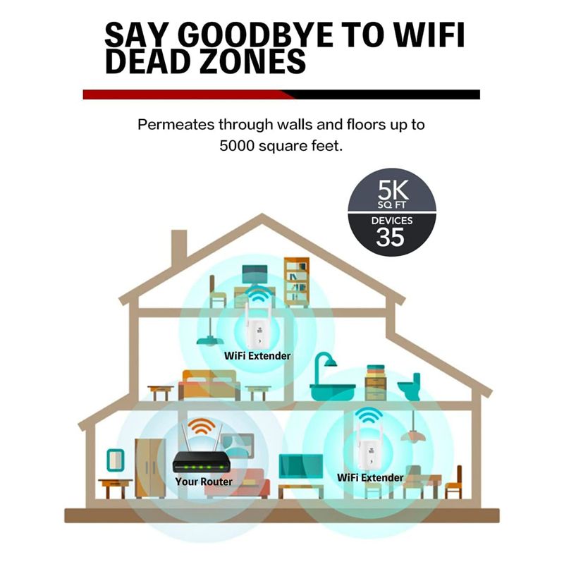 WiFi Extended Coverage WiFi extends coverage up to 5000 square feet connect up to 35 devices WiFi extender is compatible with all WiFi enabled devices and routers gateways or access points