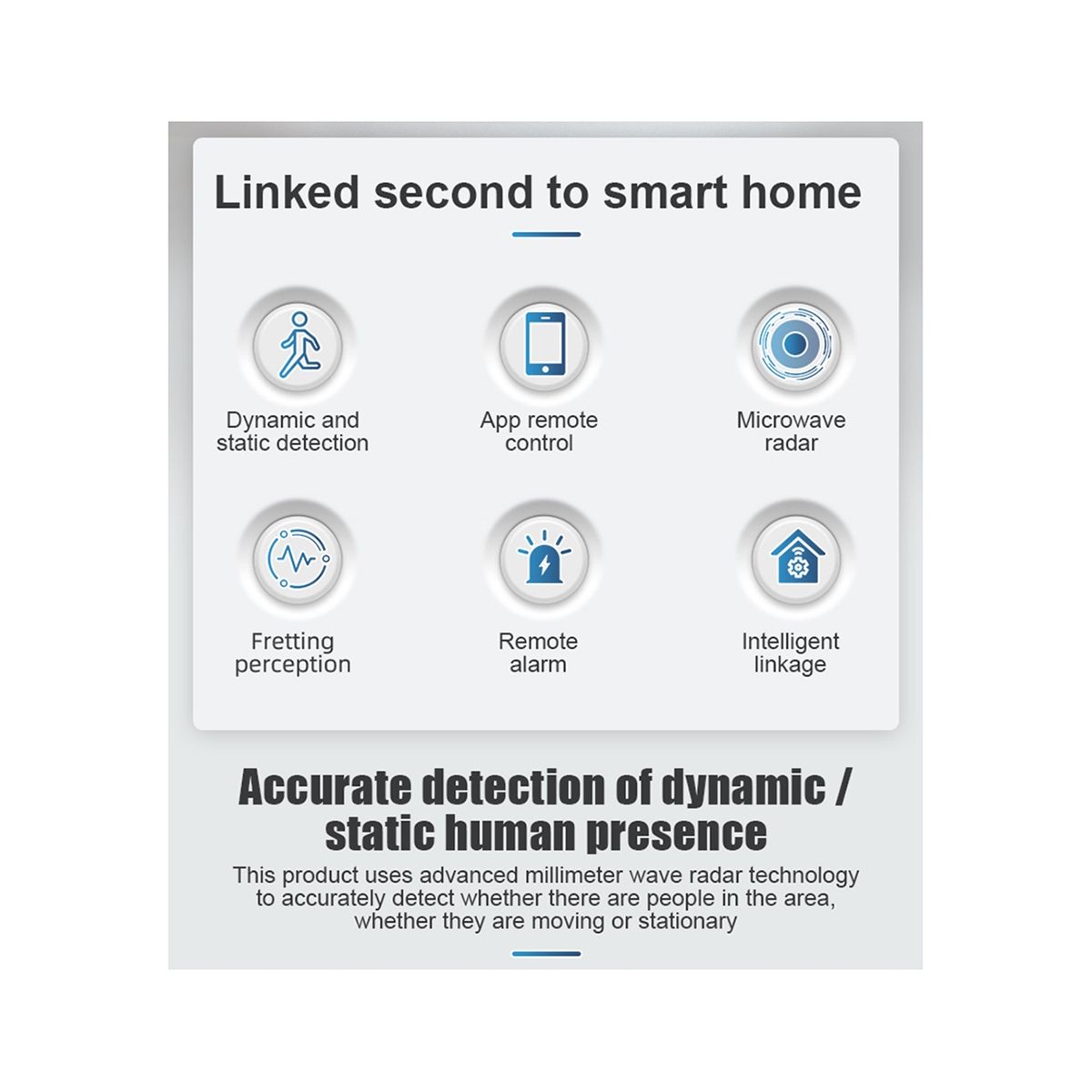 [Accurate detection of dynamic]static human presence This product uses advanced millimeter wave technology to accurately detect whether there are people in the area,whether they are moving or stationary Accurate recognition and wide range perception: human or animal movements Built in multiple people and precision sensors, the presence of people in the room can be accurately identified through intelligent algorithm.