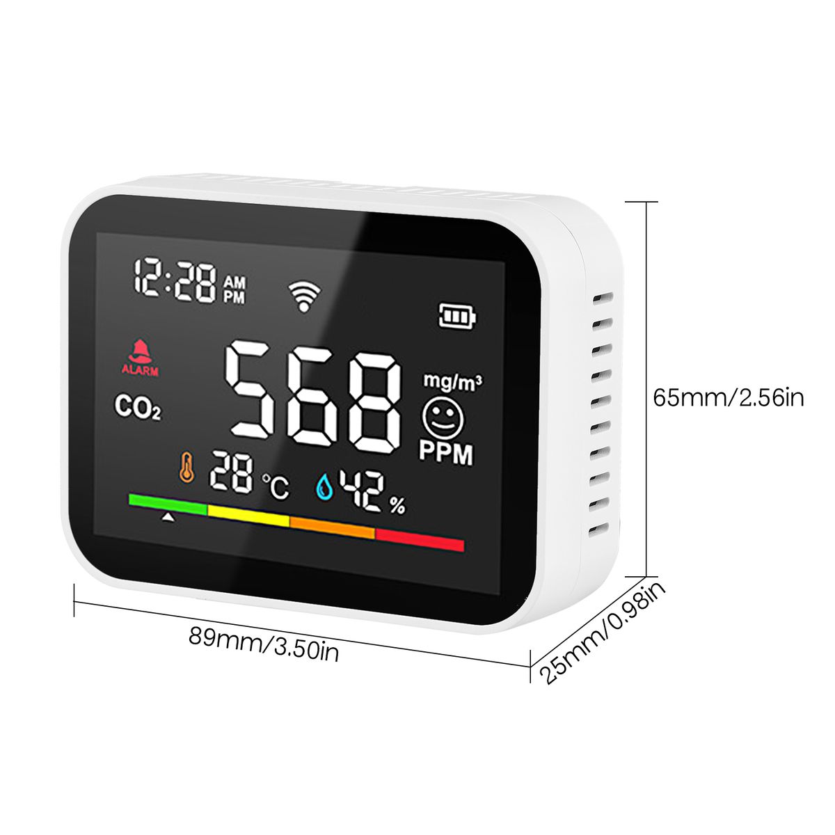 Features:2.8-inch large screen simultaneously display the current CO2 concentration, temperature, humidity and time.