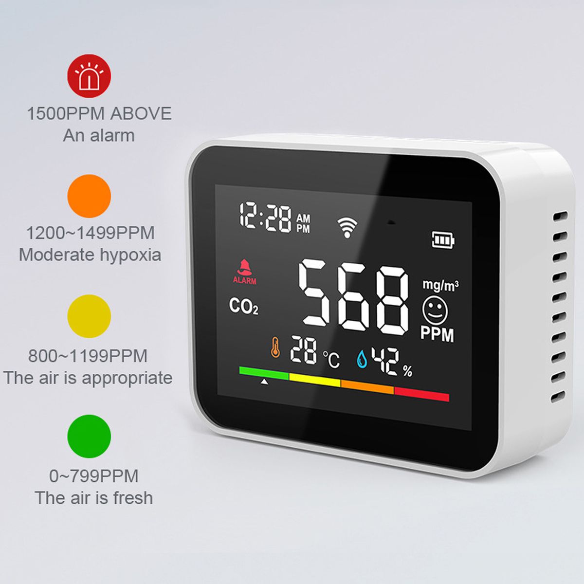 4pcs color light bar(green, yellow, orange, and red) indicate for the corresponding CO2 concentration.