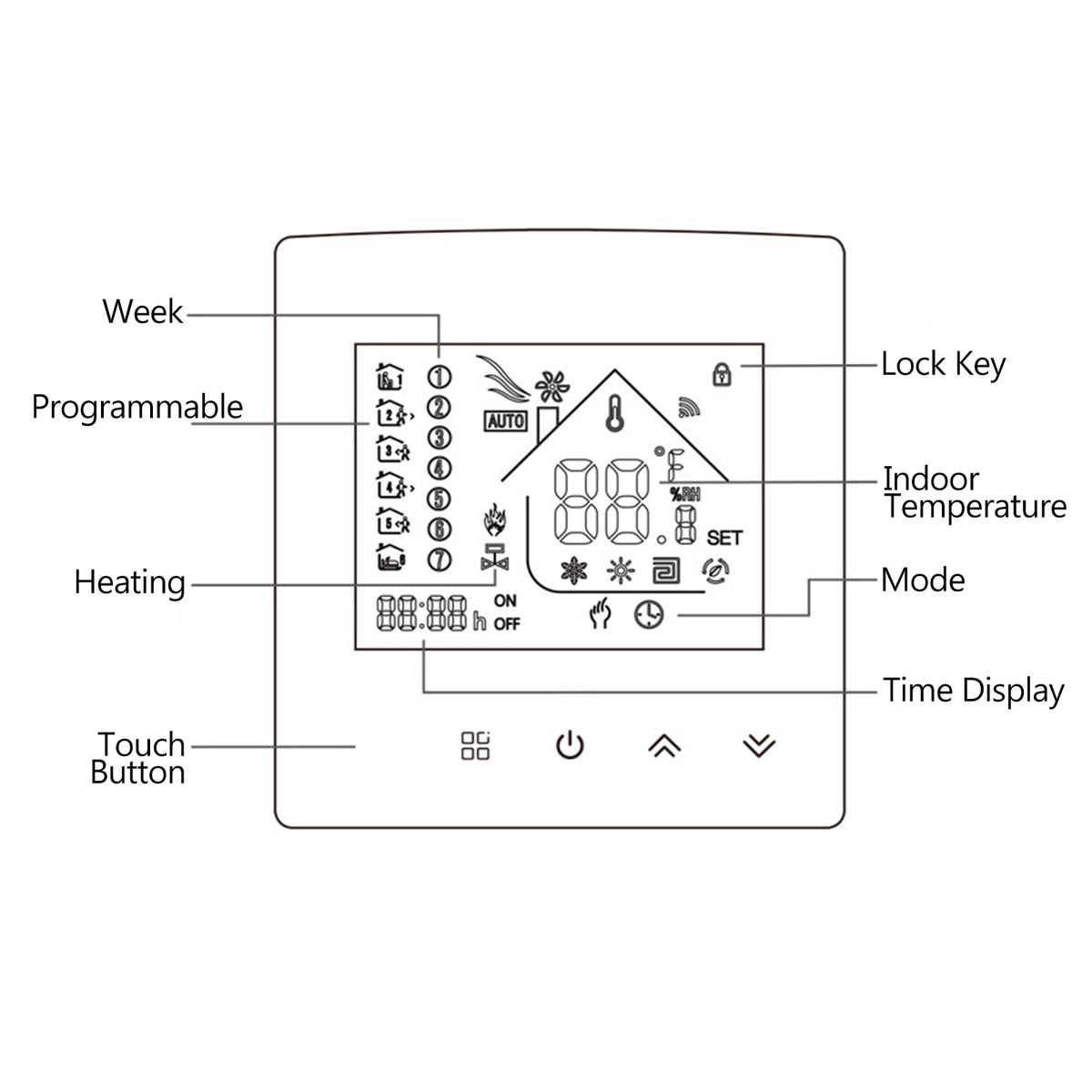 The digital temperature controller is equipped with full-screen display touch buttons, which are elegant in design and easy to use. Whether you are at home or on the go, you can remotely control the thermostat by an app from your phone.
