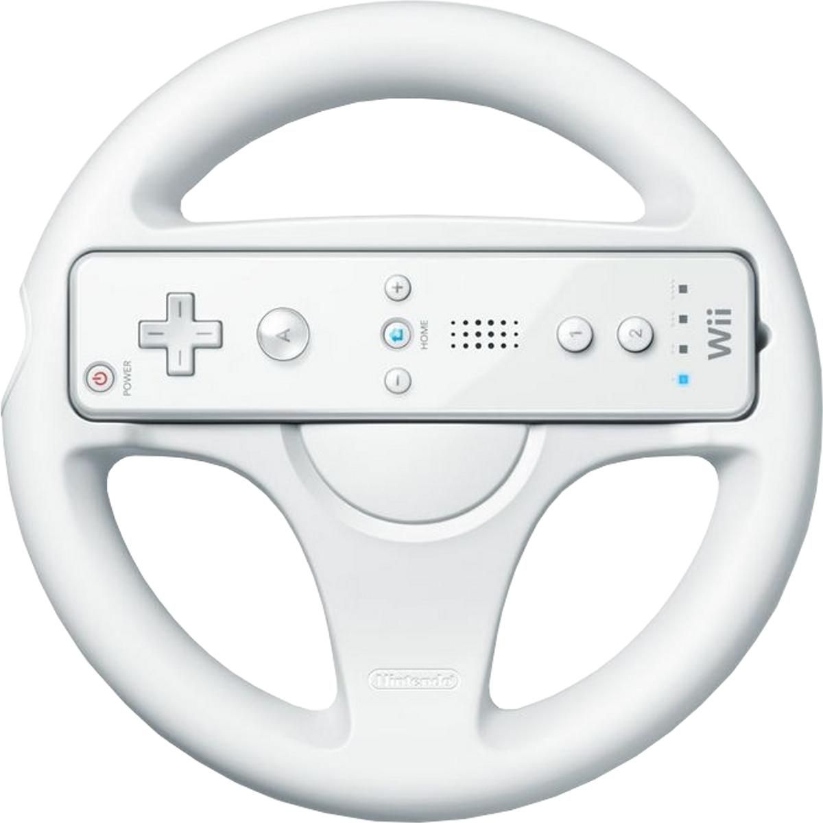 Wii Console with Mario Kart Wii Bundle includes White Wii Console, White Wii Remote Plus controller, White Nunchuk controller, Sensor Bar, composite cable, AC Adapter, White Nintendo Wii Wheel, and Mario Kart Wii game