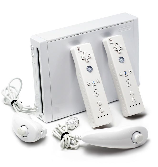 The Wii includes the Nintendo Wii System, 2 Nintendo Wii Remotes, 2 Nintendo Wii Nunchuck, AC Cable, Standard AV Adapter, and Sensor Bar