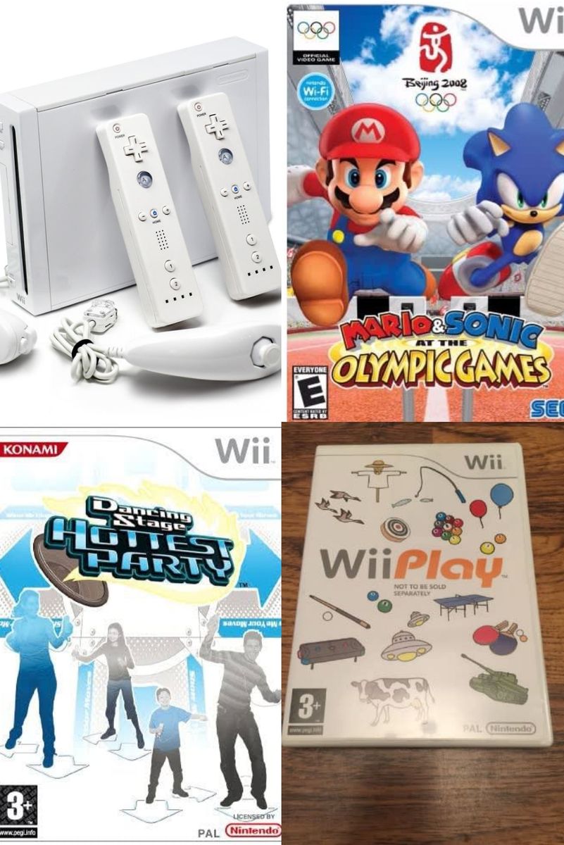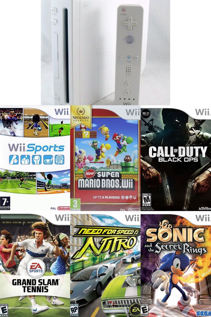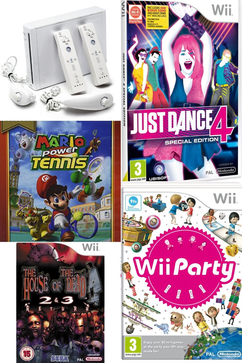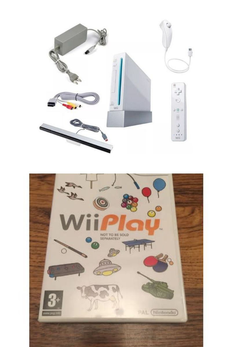 Console, Remote, Nunchuck, AV cable, Sensor bar, Power Adapter, 3 Wii Game CD