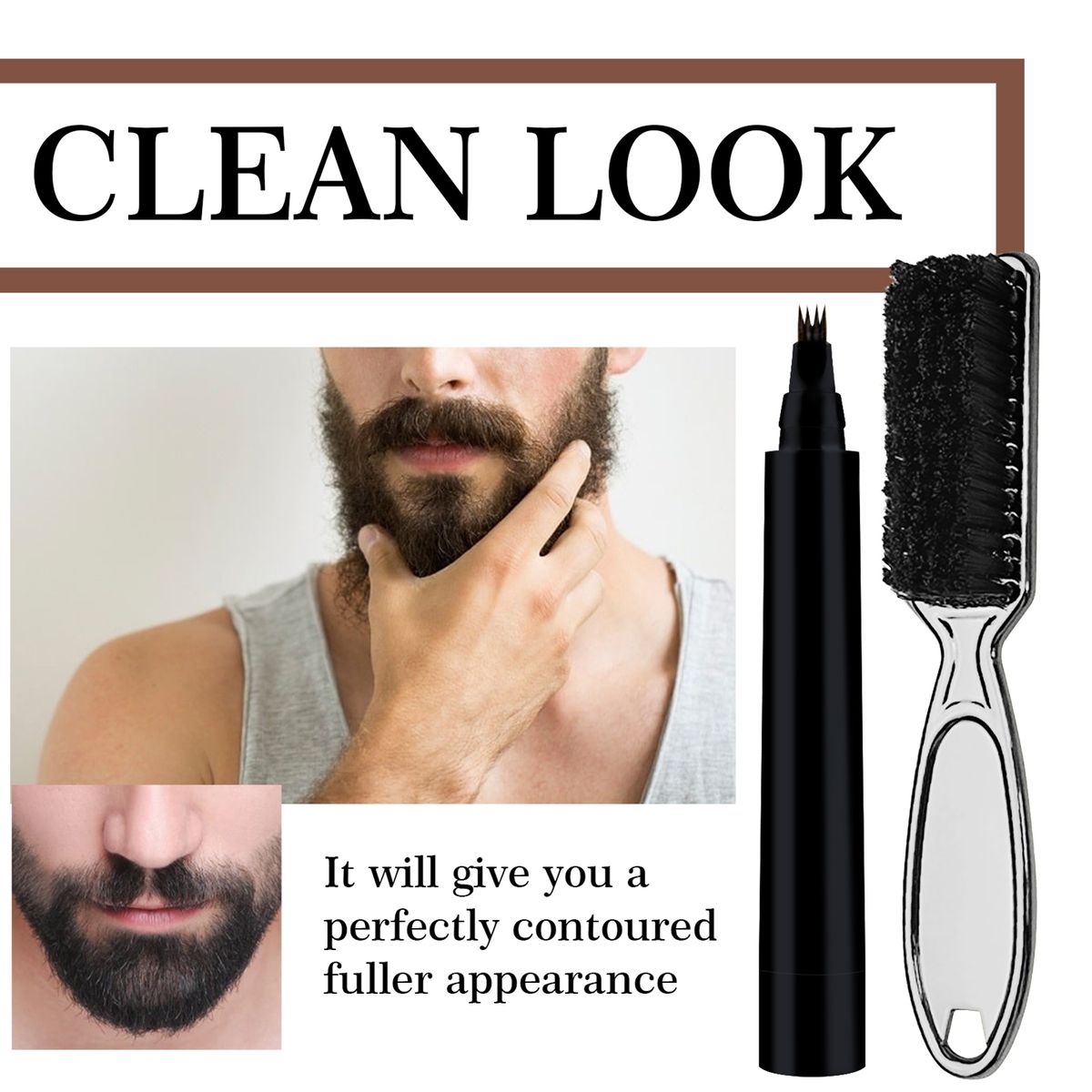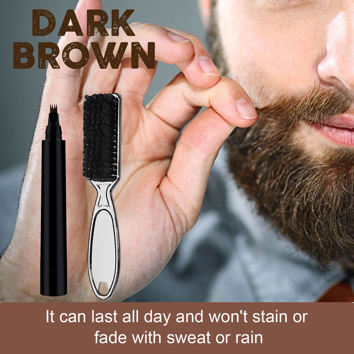 Wild bristle lastics care brush and beard filler pen combination suit, lightweight, four forks deisgn can quickly fill in the empty space of the beard, high quality ink, eco-friendly health formula, the effect can last all day and won\'t stain or fade with sewat or rain, the brush can quickly tidy up the messy beard, simple quick.