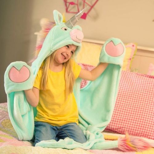 Kids can snuggle, dream, and let their imagination run wild in our magical, ultra-soft unicorn blanket featuring a rainbow mane, glittery horn, and hooves with hand pockets!