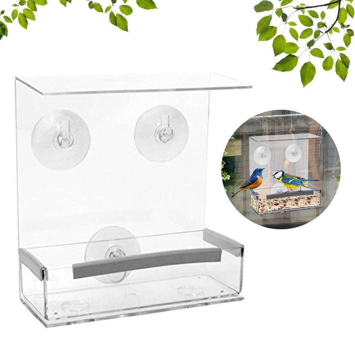 Equipped with three strong suction cups, this bird feeder can be stick to window or glass firmly. With drainage hole, rain-proof cover and great friction perching strips, this bird feeder is convenient for use.