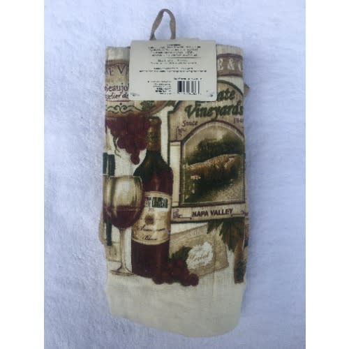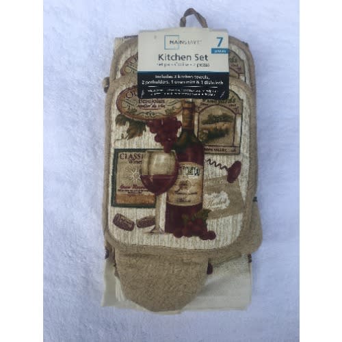 Add a rich and inviting pattern to your decor with this Mainstays Kitchen Set. It includes two towels, two potholders, one oven mitt and two dishcloths. The kitchen set features deep burgundy, gold and green colors. It is made from a 100 percent cotton material and are machine washable for easy care. The pot holders and oven mitt also have tabs for easy hanging to offer an attractive addition to your kitchen. Each piece has an attractive design with wine bottles and glasses with a Paris bistro theme.Mainstays Wine 7-Piece Kitchen Set:7-piece set includes 2 kitchen towels, 2 potholders, 1 oven mitt and 2 dishcloths100% cottonMachine washableKitchen towel measures: 15" x 25"Dishcloth measures 12" x 12"Potholder measures 6.75" x 8"Oven mitt measures: 7" x 11"Kitchen towel and oven mitt set has a stylish design. Pot holders and oven mitt have tabs for easy hanging and storage