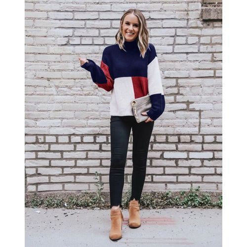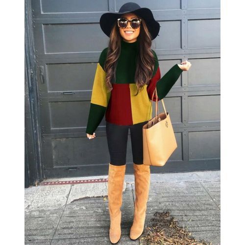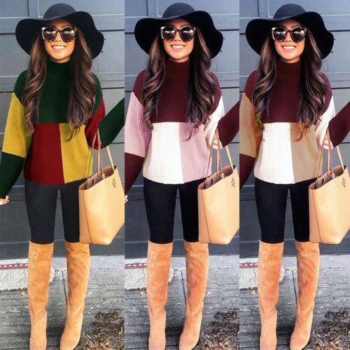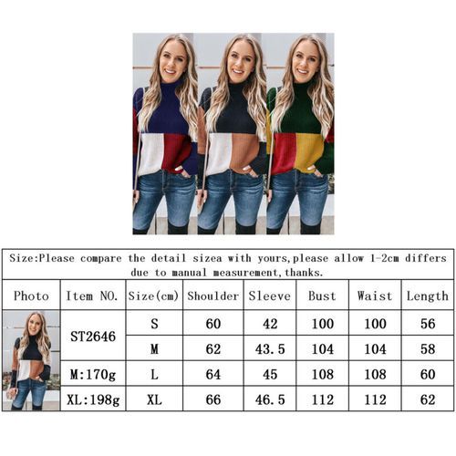 1X Winter Casual Fashion Women Patchwork Long Sleeves Knitted Turtle Neck Sweater Jumper Pullover Tops