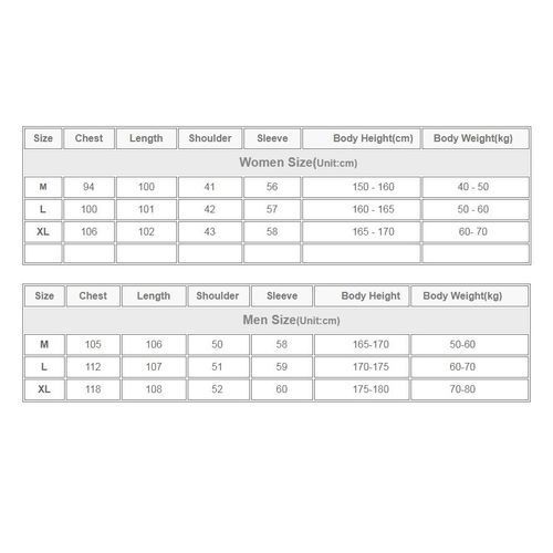 | | | | | | | | Men Size(Unit:cm) | | Size | Chest | Length | Shoulder | Sleeve | Body Height | Body Weight(kg) | | M | 105 | 106 | 50 | 58 | 165-170 | 50-60 | | L | 112 | 107 | 51 | 59 | 170-175 | 60-70 | | XL | 118 | 108 | 52 | 60 | 175-180 | 70-80 | 94Shipping and Packaging All items will be double checked and well packed before sending.Items will be dispatched within 2 business days after buyers pay for the order. It usually takes about 14 to 18 working days for delivering the package to the destination(for remote areas,it may take a little longer). Special Announcement:Please fill in the correct and detailed consignee, address and phone number in the order. For fast and correct delivery.If you do not receive order within 30 working days,please feel free to contact Customer Service before leaving Negative and Neutral Feedback, we will do our best to help you resolve the problem.TaxNo, you will only pay what is quoted as total cost at checkout, no more. You are not expected to pay any additional duties or taxes. If you are asked by Customs or our logistic partner to pay duties, please contact our Customer Service .ReturnIf the product is not on good condition, You can return this product within 14 working days, please contact customer service center before returning.FeedbackYour satisfaction is our first priorityIf you receive the order and it is in good condition,we would be grateful if you would leave us 5 star Positive Feedback for the transaction. |