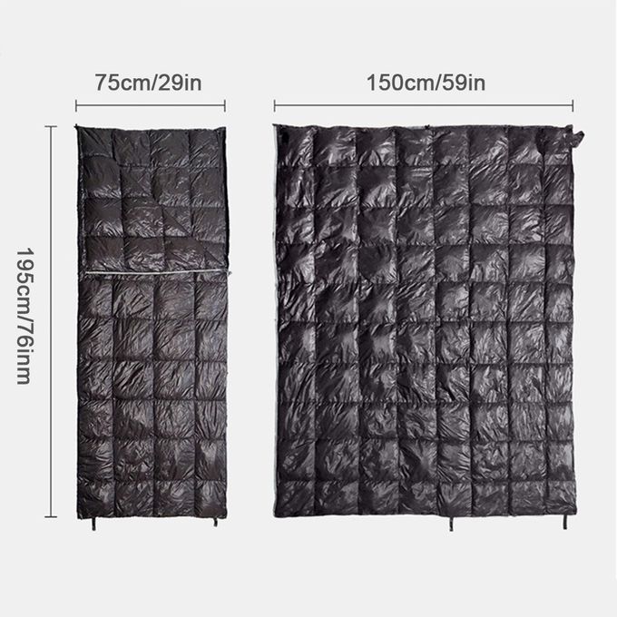 Water repellent nylon sleeping bag keep wind and water out, and with soft and fluffy down lining to retain body heat during harsh winter. This is not only a sleeping bag, you can use it as a quilt or a blanket in spring and autumn, a bed sheet in winter, and a warm coat indoors. And it is packed in a compression sack, very convenient to storage and transport.