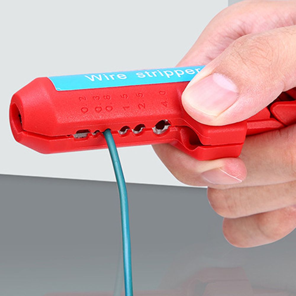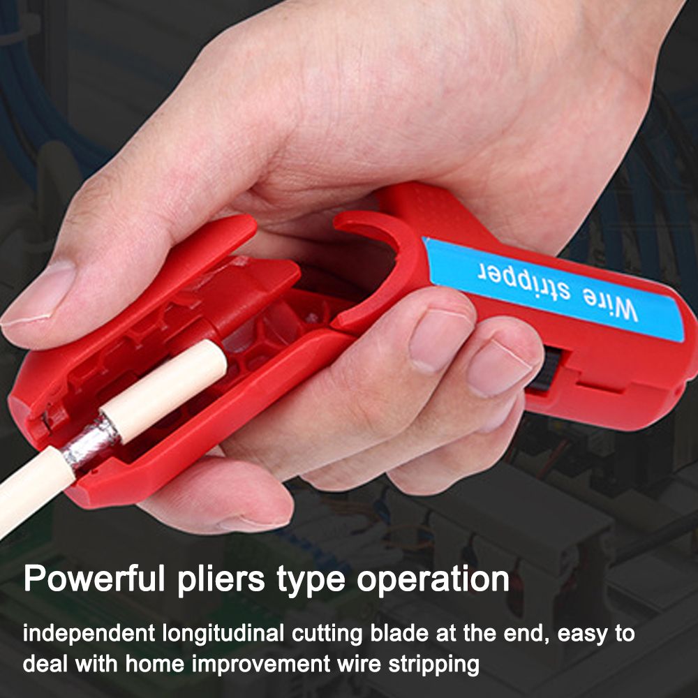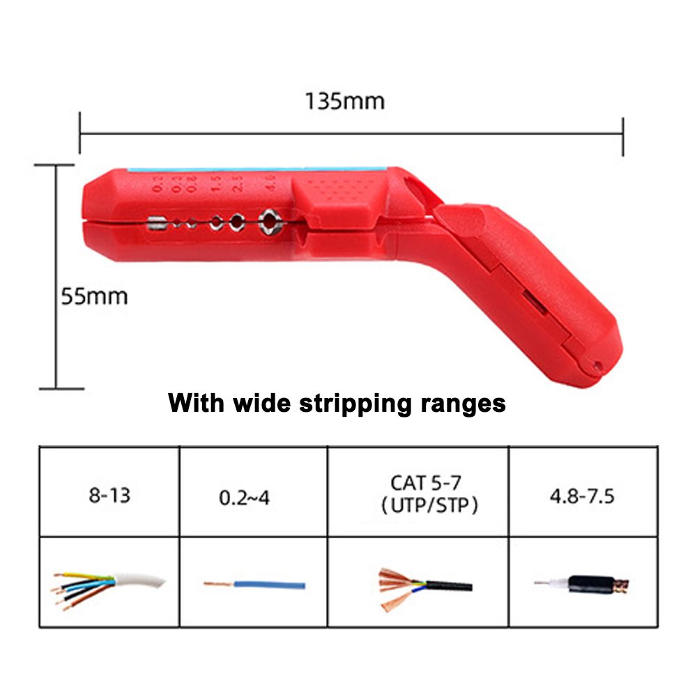Three practical designs for versatile use and easy wire stripping. Fiberglass-reinforced plastics body for high strength. Features a high-resilience spring and locking mechanism. Inside with sharpening cutter for longitudinal cutting with thumb pressure, safer to use. Suitable for stripping φ8-13mm regular round cables, φ0.2-4mm conductors, φ4.8-7.5mm coaxial cables, CAT5-7 data cables, and so on.