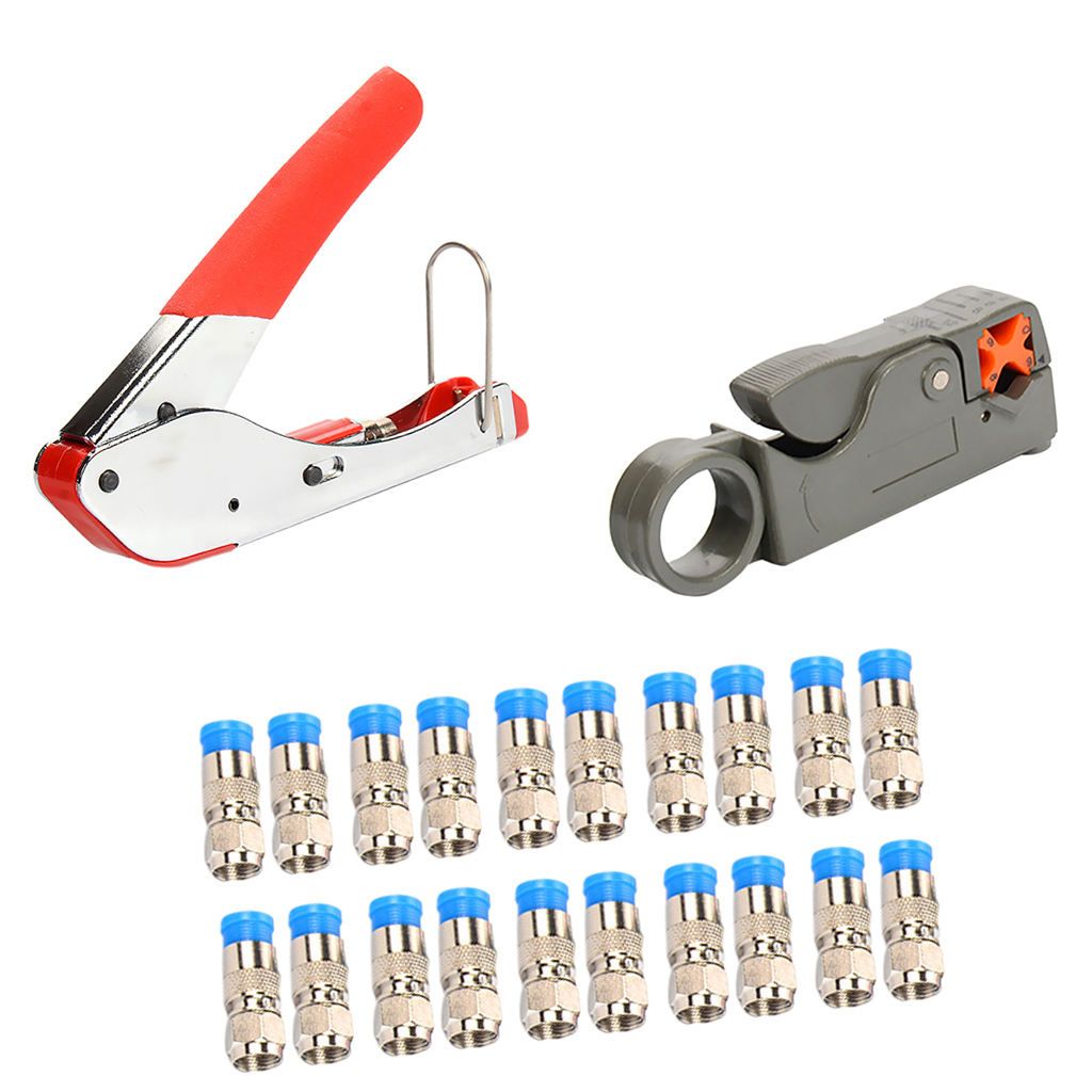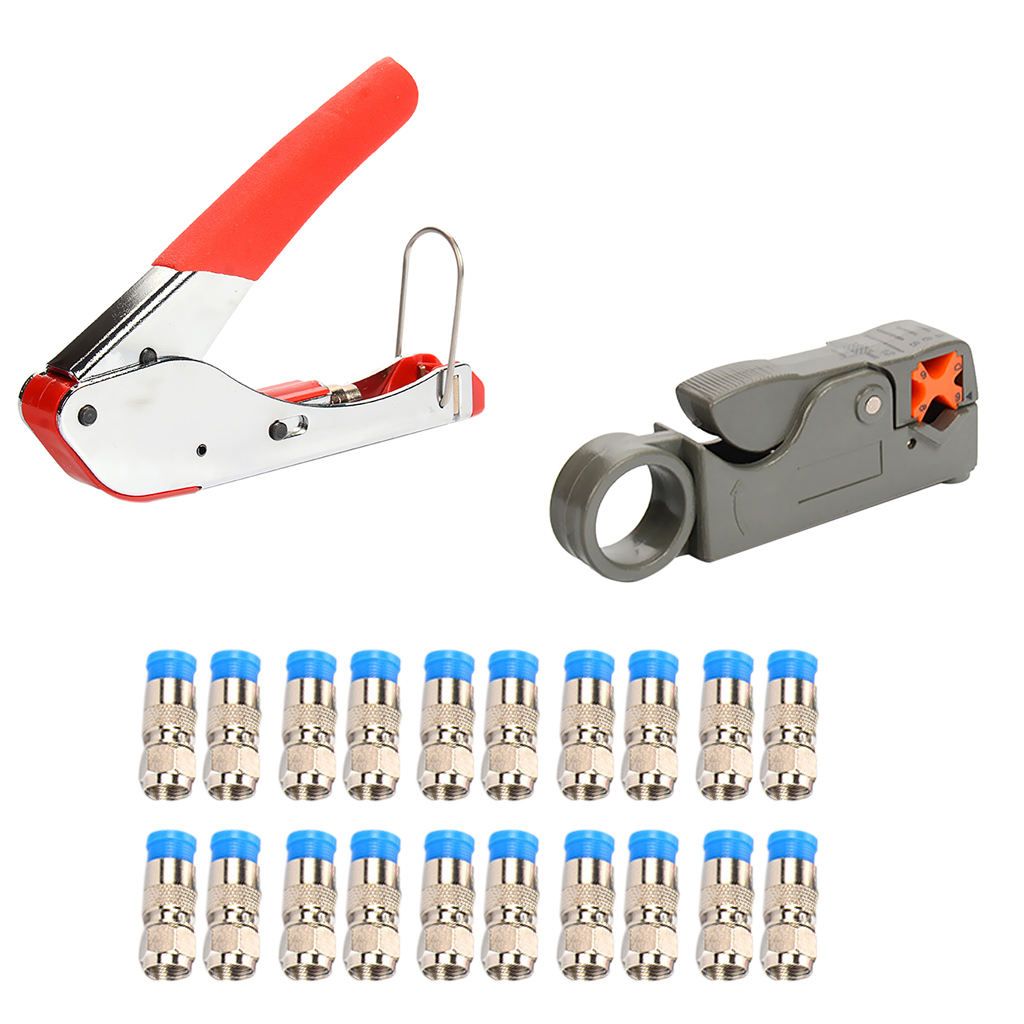 Crimps compression F-connectors to coaxial cable quickly and reliablyCoaxial cable stripper has a rotatable adjustable head for coaxial cable RG58,59 RG6.Includes 20 universal Coaxial Locking Compression Connectors.Perfect for various applications, for example, reception apparatuses, catv, , cctv, boadband cabling,etc.Equipped with hexagonal tools can adjust the depth of the v-shaped incision