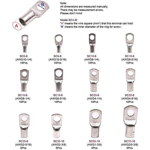 About model SCA-B:"A" means the wire square(mm²) that this terminal can hold, "B" means the inner diameter of the ring for screw. applications