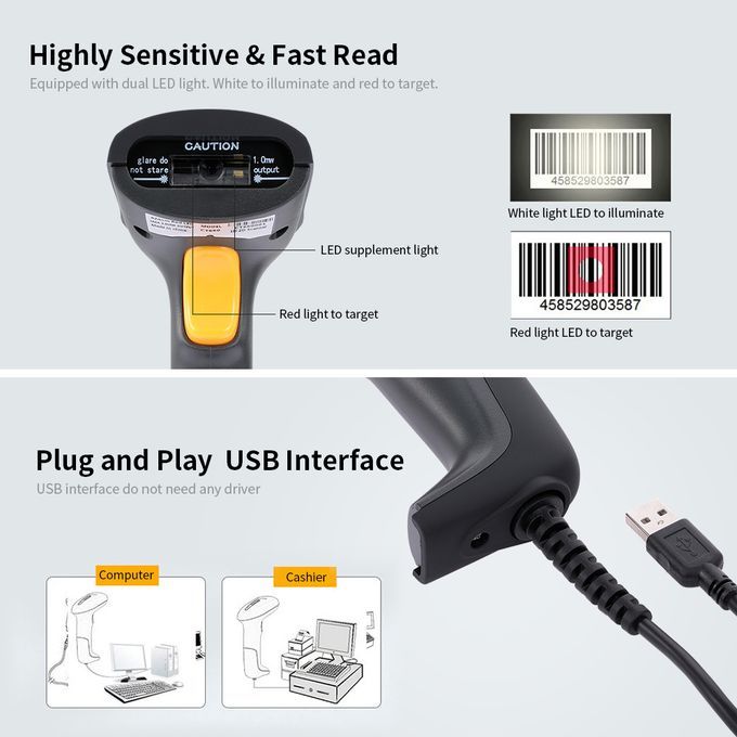 The wired barcode scanner can read all international standard 1D and 2D code with advanced reading performance of the decoding chip. and easy one-button operation greatly increases work efficiency while avoiding a series of failures due to complex setup steps.