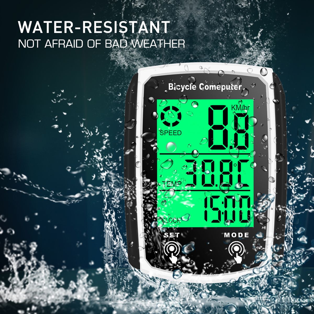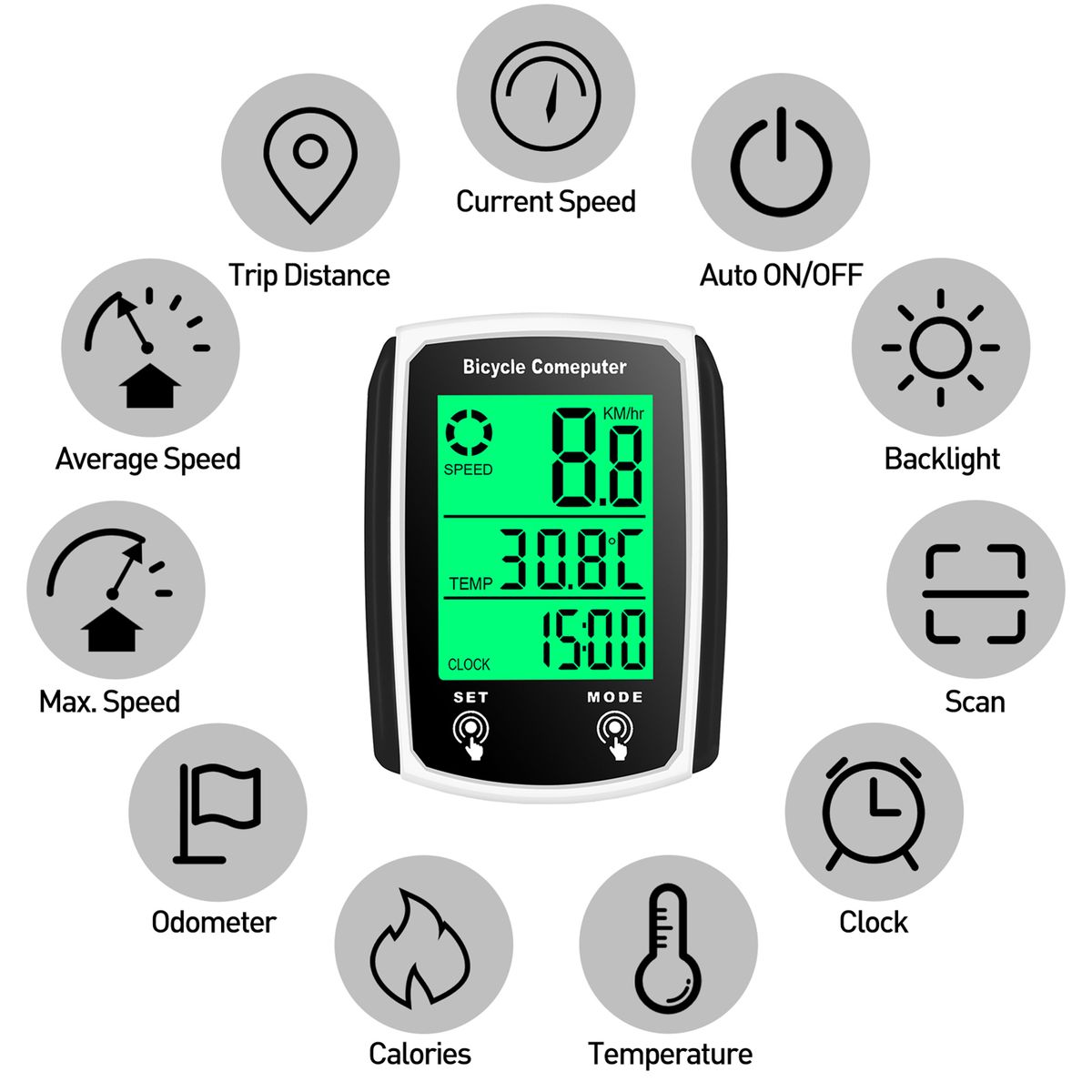 19 functions: current/max/average speed, odometer, trip distance, elapsed time, calories, temperature, scan, clock, and more.