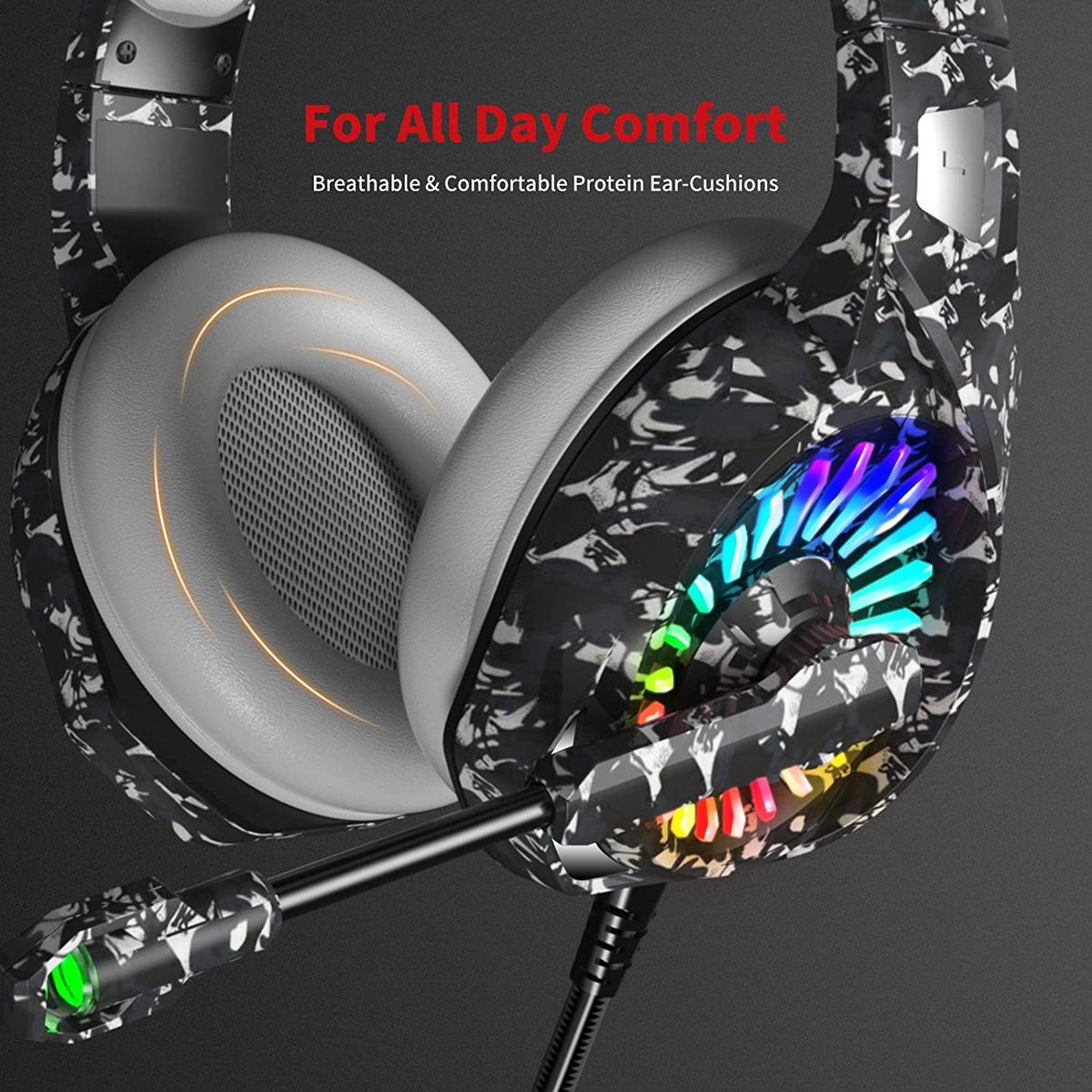 Comfortable Protein Earmuffs: gaming headset is fitted with large-diameter breathable protein ear cushions which fit completely around the ears, but no direct pressure on soft tissues and provide passive noise isolation