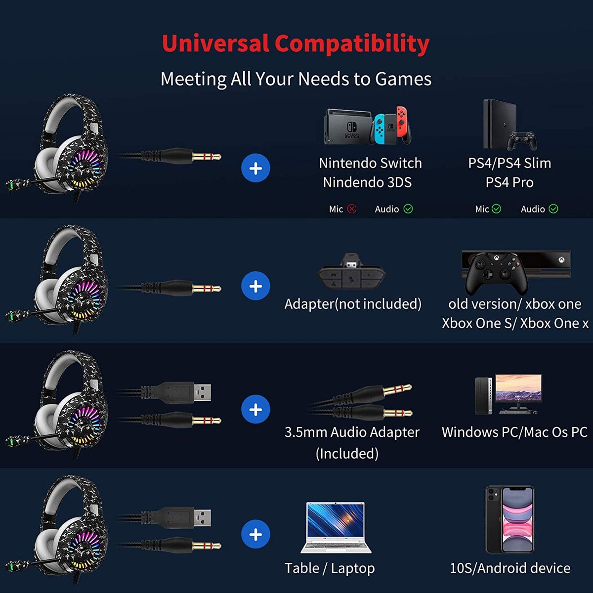 - Multi-platforms headset: This gaming headset with a 3. 5mm audio jack is compatible with PC, PS4 controller, PS5 controller, Xbox One S / X controller(Please note: newer models have a headphone jack, older ones require an adapter. ), Nintendo Switch, Nintendo New 3DS LL/3DS, Nintendo 3DS LL/3DS, Mac, Laptop, Phone