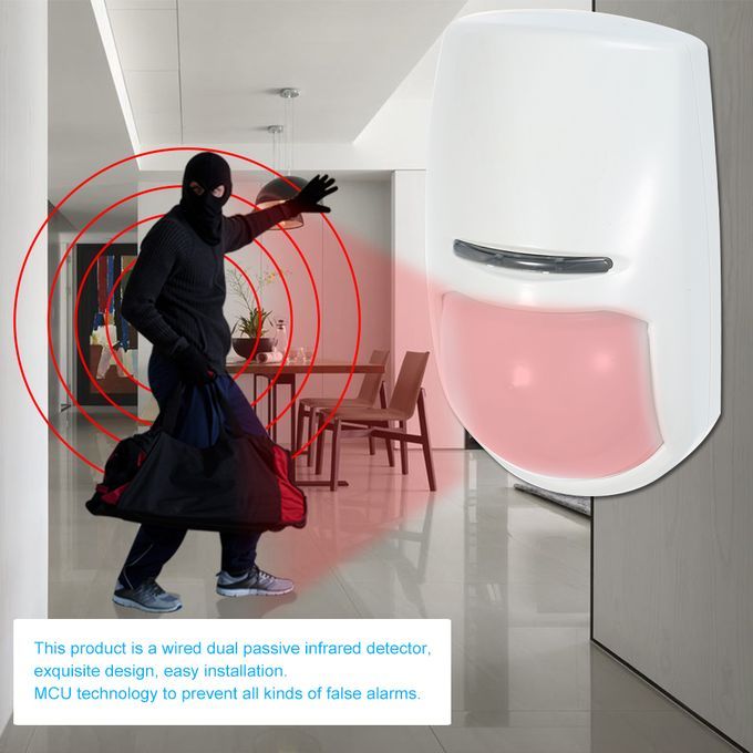 This product is a wired dual passive infrared detector, exquisite design, easy installation. Fit for the locations of the balcony, window, door, corridors, outdoor, etc. high-end infrared sensor, SMT chip technology, anti-EMI & anti-RFI design, temperature compensation, pulse count, LED switch, etc. selectable functions, can be integrated with wired alarm host.