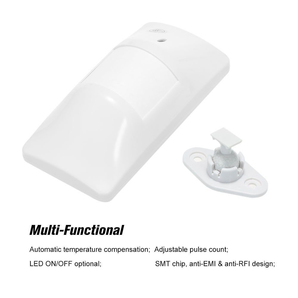 This product is a wide angle passive infrared detector, exquisite design, easy installation. Fit for the locations of the balcony, window, door, corridors, etc. Imported high-end infrared sensor, SMT chip technology, anti-EMI amp; anti-RFI design, temperature compensation, pulse count, LED switch, etc. selectable functions, can be integrated with wired alarm host.