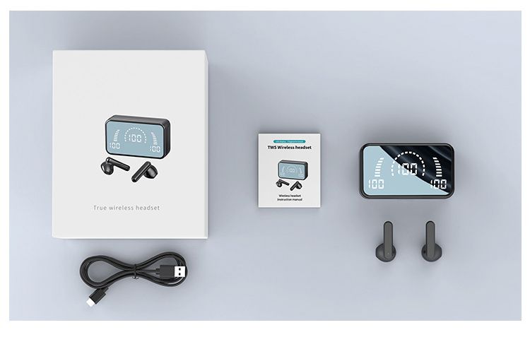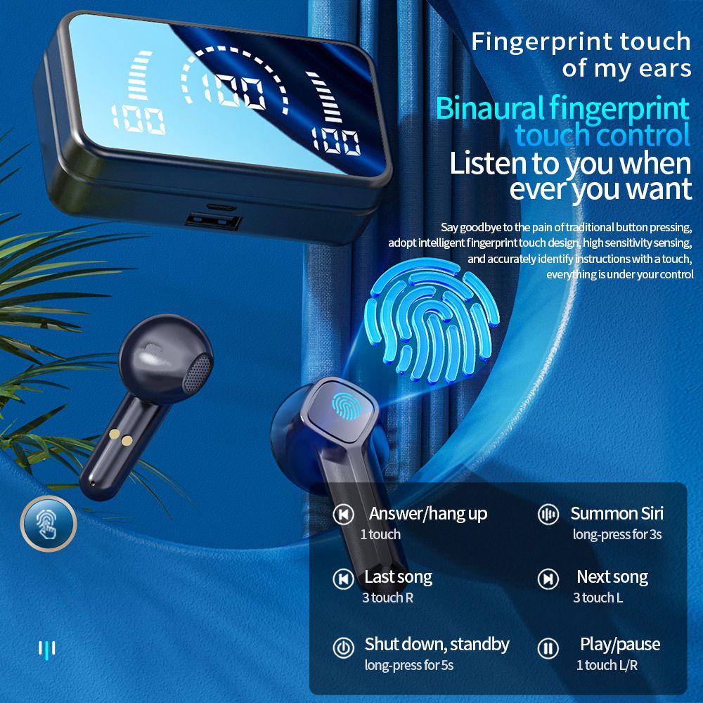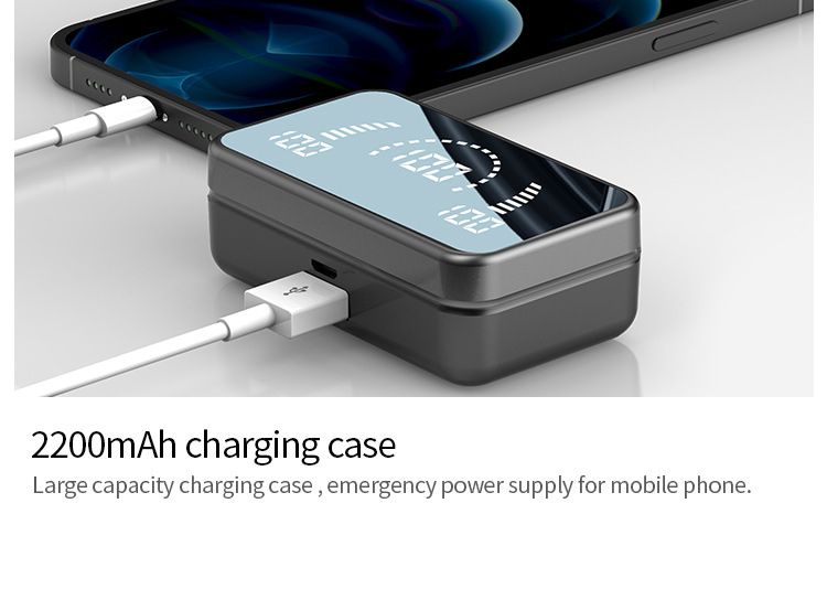 Features: 1. Three kinds of real-time power display on full-screen mirror 2. Ergonomic design, comfortable to wear, small and light, more intimate on the ear, as if nothing 3. Automatic pairing when power on, regardless of the main and auxiliary ears 4. Intelligent double noise reduction 5. Bluetooth 5.2 6. Fingerprint touch 7. 2200MAH large-capacity charging compartment, used with the charging compartment for more than 220 hours 8. Can charge the phone 9. Binaural HD calling