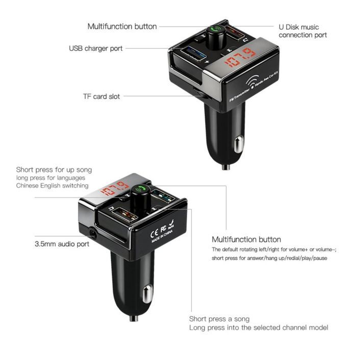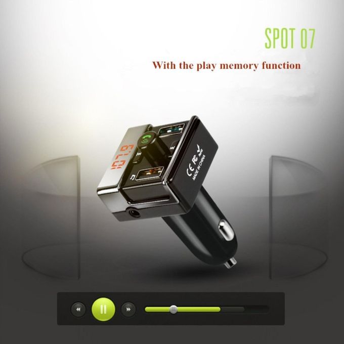 description 1. Can adjust to any angle, and fit all types ofVehicles 2. Full frequency FM transmitter 3. Digital Dispaly 4. Support Line Audio Input 5. Support U disk TF card player 6. Support MP3, WMA music format 7. Bluetooth answer, hang up, reject, redial the call and otherfuntions. 8. Bluetooth stereo music player 9. Echo cancellation and noise suppression (CVC) technologyduring a call specification: Model: A7 Single head weight: 37 grams Product + accessories + packaging weight: 63 grams Product Size: 7x4x4 CM Product External Packaging Size: 9.8x5.4x4.9 CM Outside Carton box size box: 41x28.5x27 CM Packing number: 100 sets / box Net weight: 6.4 kg kg Total weight: 6.5 kg kg
