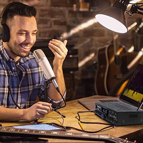- Mi priority talk-over: the wireless speaker reeiver home stereo amp has a mirophone priority talk-over funtion whih is great for Karaoke, stage performanes, & rowd ontrol. You an also adjust the treble, b, Master & mi volume