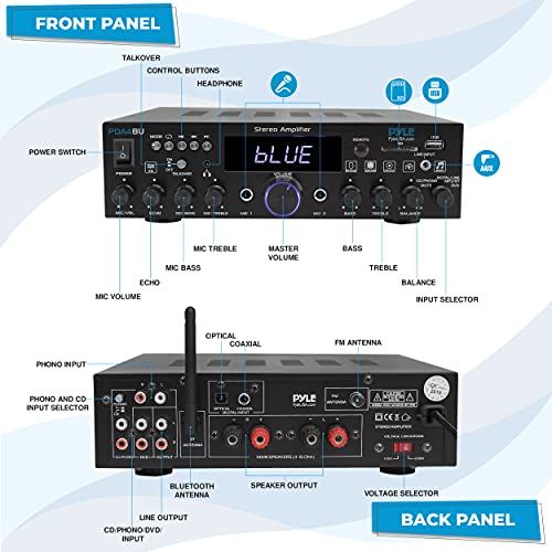 Details: Features: - USB Flash drive & SD Memory Card readers - FM Radio with LED digital display - aux (3. 5mm) input - desktop audio Mini power amplifier - ompat home theater-stereo reeiver style - built-in Bluetooth for wireless Musi Streaming - phono inputs - Optial/oaxial digital signal inputs - multi-hannel audio input seletion - MP3/WAV audio files support - onnet & Stream Audio from external devies - (2) 1/4 Mirophone input jaks - (2) pairs RCA (L/R) audio Input onnetors - (2) pairs banana plug speaker output onnetors - (1) pair RCA (L/R) audio output onnetors - (1) 1/4 Headphone output jaks - mi talk-over ability to speak over audio, karaoke style - front panel Audio Control Center - radio station auto-searh san - repeat audio file Funtions - treble, B, Master & mirophone volume adjustable Bluetooth onnetivity: - reeives wireless signal for audio streaming - Simple & Hle-Free Pairing setup - integrated antenna for extended wireless range - Works with all of todays latest devies - (Smartphones, Tablets, Laptops, Computers, et. ) - Bluetooth Version: 4. 2 - Bluetooth Network Name: PDA4BU - Wireless Range: 40+ ft. Whats in the box: - desktop stereo amplifier - Remote Control - FM antenna tehnial Spes: - LED sreen size: 3. 3 x 1 - Remote Control : 3V Lithium ell (CR2025) inluded - Max power output: 25 Watt ( 4 Ohm) - RMS Power Output: 20 Watt x 2 ( 8 Ohm) - tone ontrol: B, f=Hz +/-12dB, treble, f=10 kHz +/-12dB - tone ontrol for mi: b, f=Hz +/-8dB, treble, f=10 kHz +/-8dB - Frequeny Response: 20hz-20 kHz - frequeny adjustment: +/-2dB - Signal to noise ratio: >71dB - T. H. D. : 48dB - power Supply: 115V/230V, swithable - Dimensions (L x w x H): 10. 2 X 9. 8 X 2. 8 -Inhes
