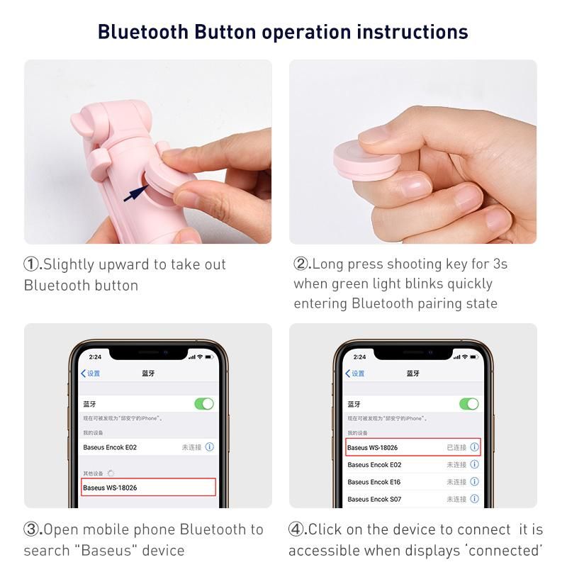 3 in 1 Wireless Bluetooth Selfie Stick 1. 2 in 1 Tripod & selfie stick / 2.Support horizontal and vertical shooting / 3.210 rotation viewing / 3.Integrated design / 4.Four-stage extension and retraction / 5.Shooting with bluetooth remote control,free your hands / 6.Aluminum alloy pull rod, durable for use Buletooth Wireless Control Camera Shutter Support controlling up to 10m, free your hands, get the best shots and videos without stranger Four-segment Telescopic Never Become A Big FaceStretching to to 650mm, making your face perfectly smaller Supported with Tripod, Each Photo is MasterpieceSupport with SLR tripod ,Having fancy long legs immediately Beauty UP , True SelfieNot only the original Camera but also various beauty Apps are supported 210 Degree Rotation ,Provide the perfect view angles, convenient to take pictures, enjoy the autodyne life Long standby time up to 2 monthsProvided with replaceable button cells for 2 months' continuous usage Pack into the Bag and Take Photos on the GoIntegrated storage, compact and convenient, without occupying the bag space Indispensable for Hanging out with Best FriendsIntegrated with selfie stick and tripod Take photos as you like in dating and shopping Clip and Firmly Hold Never Miss a Shooter for Photo before MealBuilt-in high-elastic spring for firm clamping Clamp Length can Stretch to 85mm!!! PERFECT for iPhone (for iPhone 11 ,11 pro , 11 pro max ,7,7 Plus, 6s, 6s Plus,for iPhone 6, 6 Plus,for iPhone 5, 5s, for iPhone 4) and any Smartphone up to 3.4" wide (for Galaxy S6, S6 Edge, S5, S4, Galaxy Note,for LG G4, LG G3 and many more!.............)