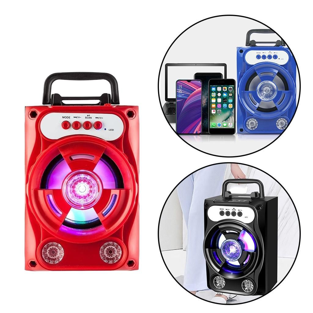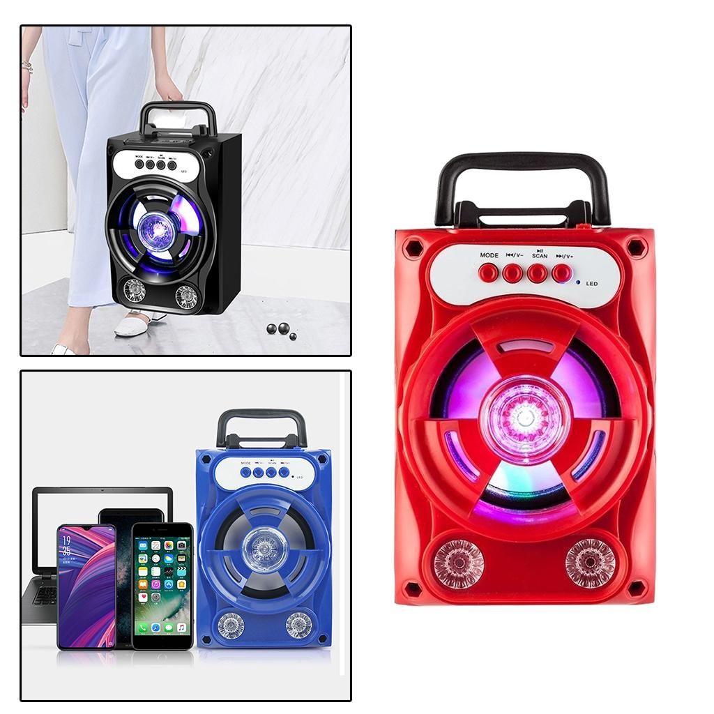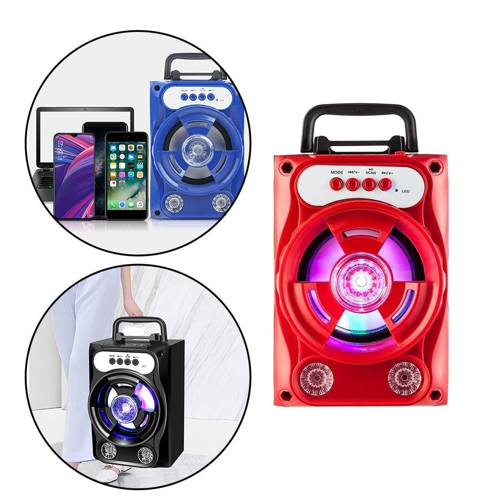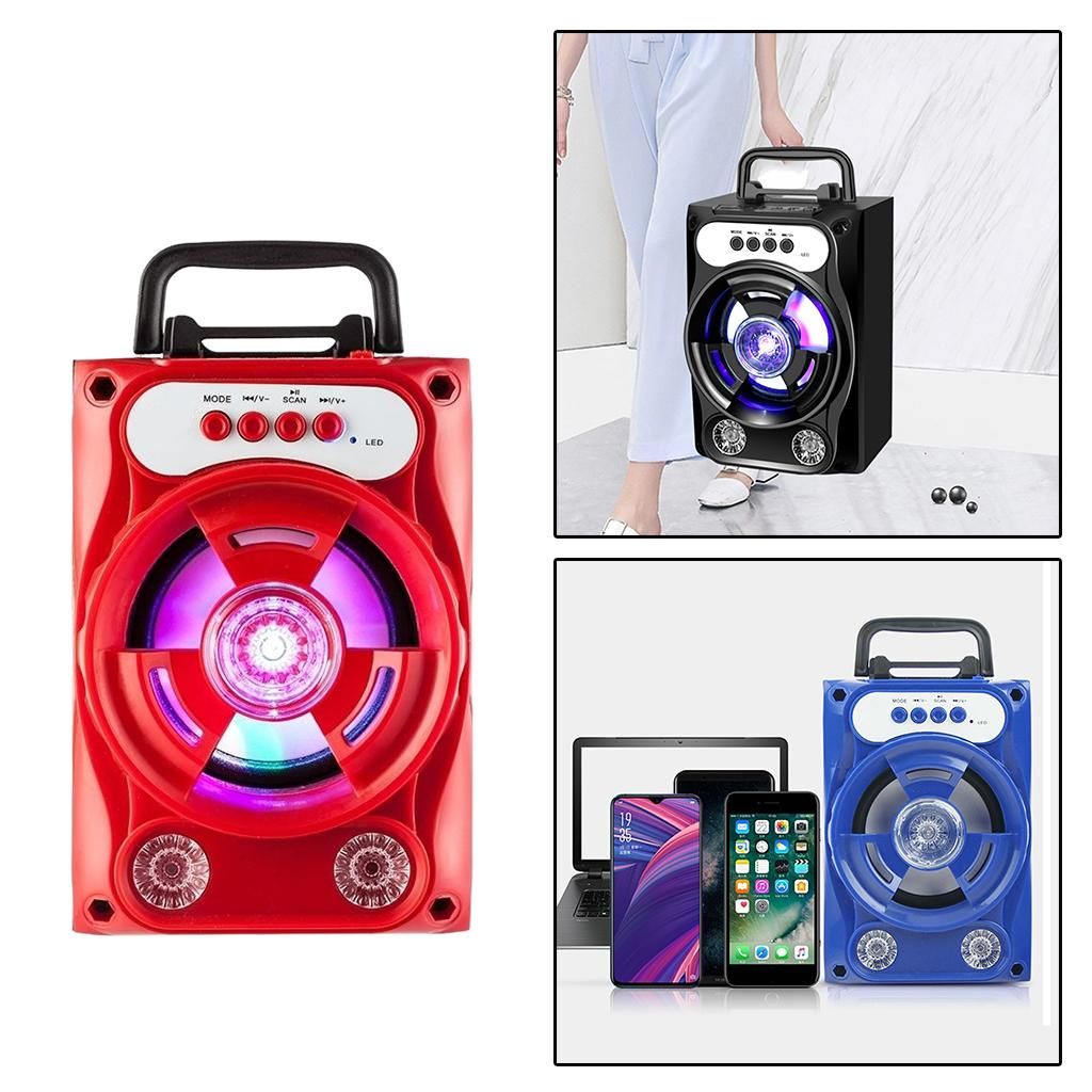 High volume, colorful light wireless Bluetooth FM radio HIFI sound quality. Support microphone, plug and play, mini portable.Portable design, sound, key operation, surround sound. , Bluetooth, support audio cable connection.Support TF card Support U disk Support MP3 format, continuous playing time 3-6 hours according to volume.Can freely connect with your mobile phone and other digital devices.Applicable to places such as square dance, morning exercise, promotion, stall selling, outdoor activities, family, etc.