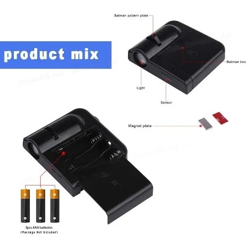 The door laser wireless sensor Light Lamps can be installed in both left & right door. Courtesy door light make your car artistic moreover the atmosphere. The dazzle logo light and the signal light will display on the ground when you open the car door and it will be turn off when you close the door.Easy installation. No need drill hole. Just stick the light lamp on the door panel and stick the magnet on the bottom of the car frame. No harm to car. replace at will for the logo film slide,Powered by 3 Pcs AA batteries(Package Not Included).It will be brighter at night or at dark place,effect is not obvious at daytime.Light to open doors. Projection design can give others a warning to avoid an accident.This product is specially designed for auto modification fancier; we purpose to bring more driving fun to drivers.