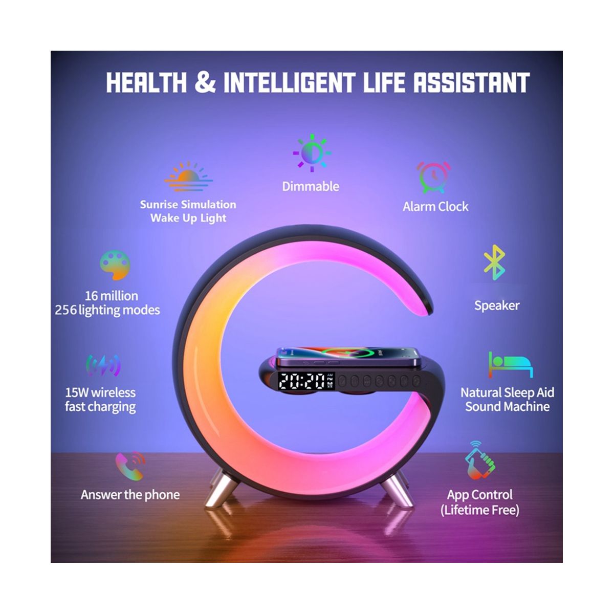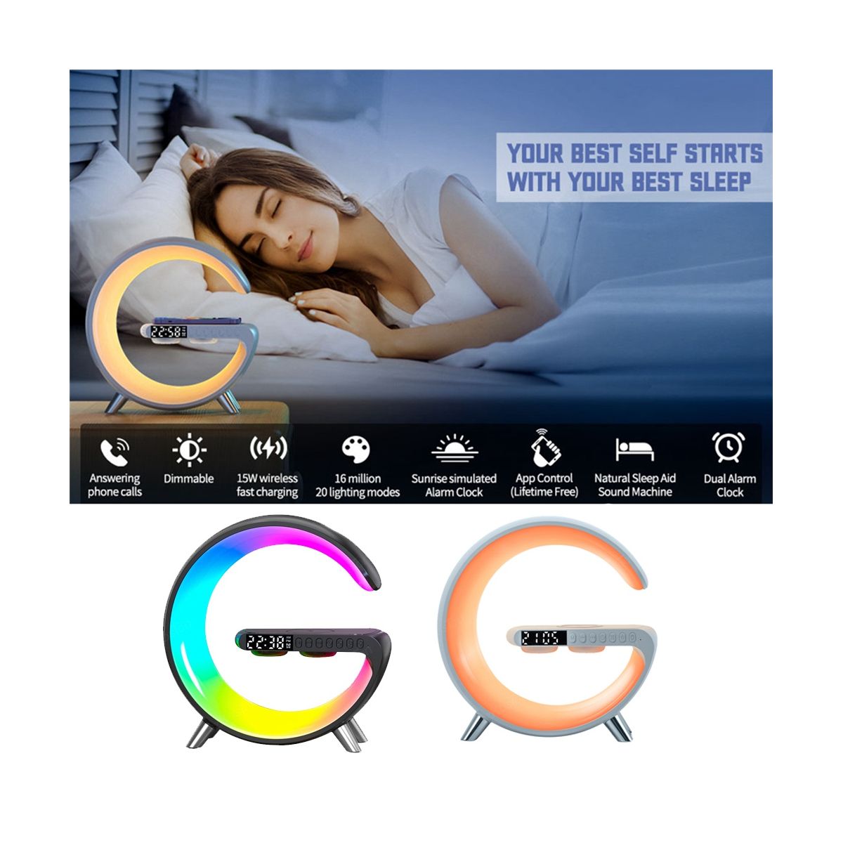 15W wireless charging, sleep lamp, sunrise lamp, atmosphere lamp, bedside lamp, dazzling light effect, Bluetooth audio, clock, alarm clock