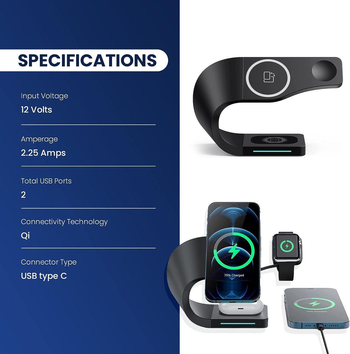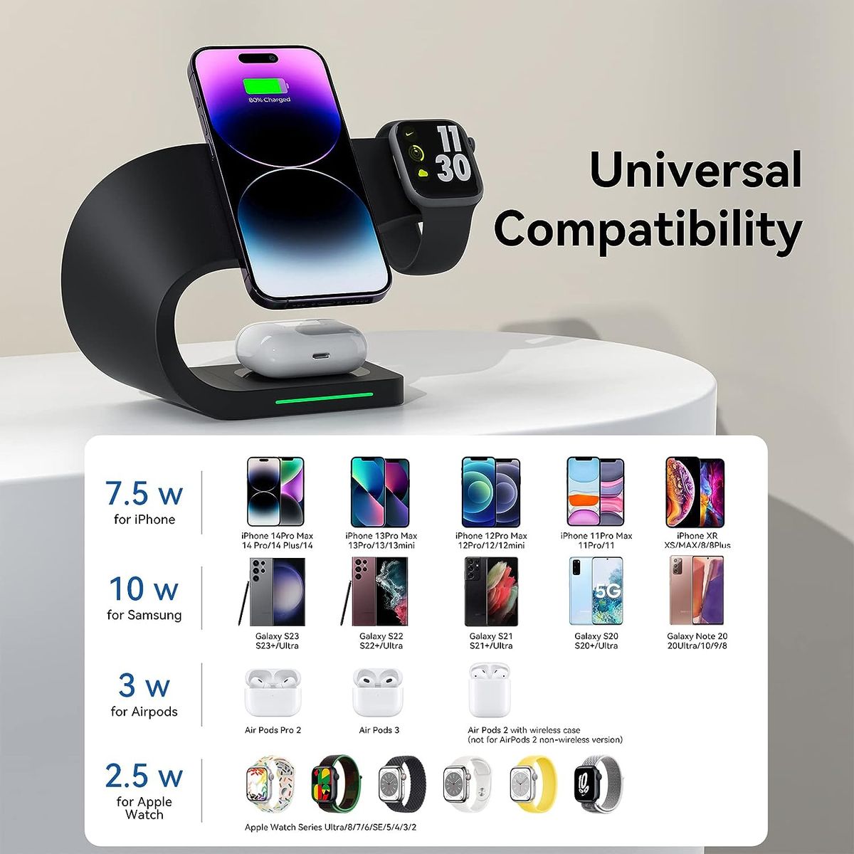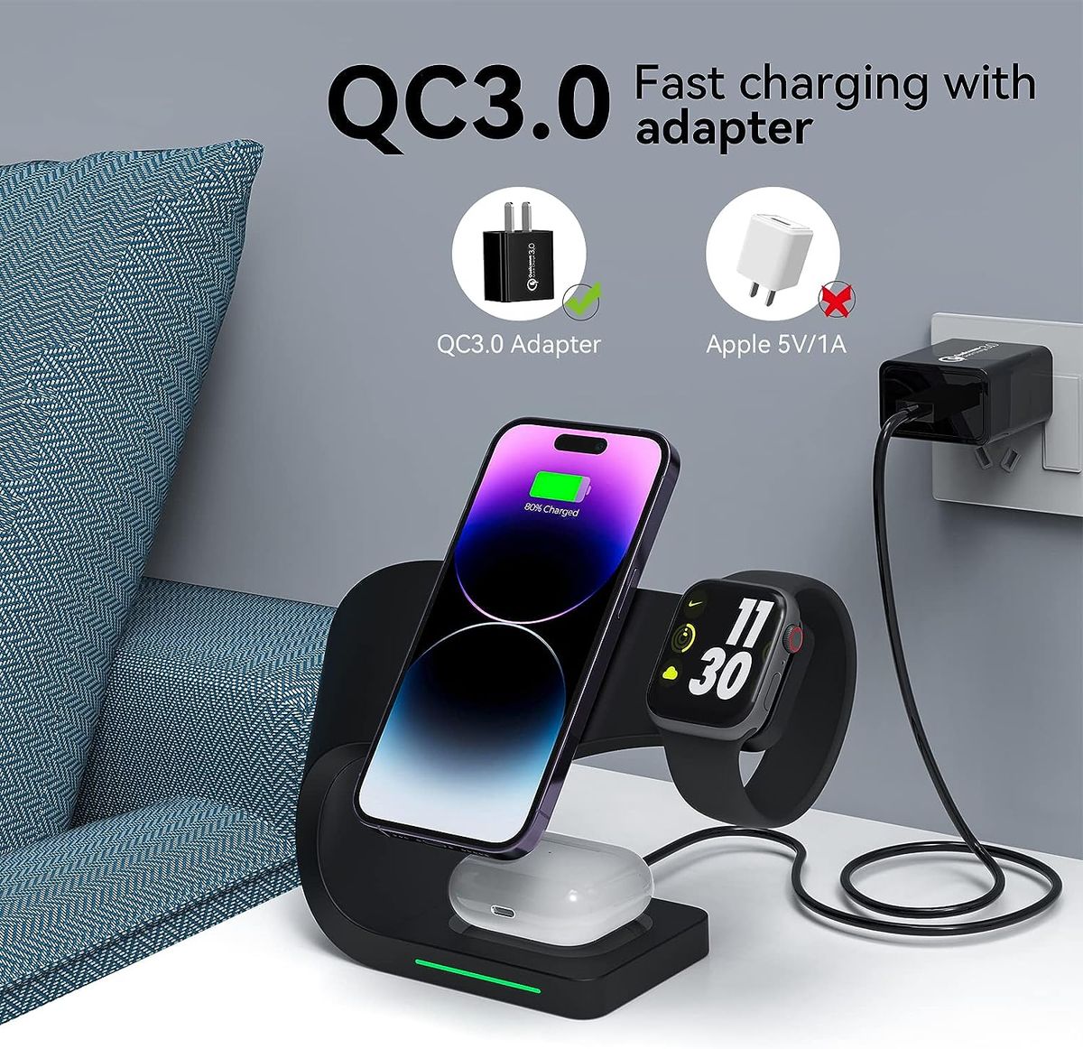 Wireless Charger,Charging Station for Phones, Apple Watch & AirPodsClutter-free: Our wireless charger is a compact solution to organize your workspace or nightstand. Its one-cable design charges iWatch, AirPods, and phones, saving you from the hassle of multiple cords. This sleek charging dock offers a clutter-free and wireless experience.Smart protection: Get a safe and fast charging experience with our wireless charging station. The certified QC 3.0 18W fast adapter combined with heat dissipation holes prevents overheating and damage while keeping the charging speed at its maximum - 30% faster than other wireless chargers.Case friendly: Say goodbye to the hassle of removing your phone case every time you charge. Our fast charging station can charge your phone directly through cases up to 0.2in thick. (Note: Remove magnetic/metal attachments or credit cards for stability. Not compatible with the Otterbox Commuter case).High-quality: Our wireless charging stand is designed with high-quality materials to prevent scratching your devices. The charging stand's clever cable management system hides iWatch and AirPods Pro cables, saving valuable desk space.Safe & reliable: Our multi charger station is 100% safe and reliable, equipped with multiple safety protections including over-current, over-voltage, over-temperature, short-circuit, and overcharge protection to ensure the full protection of your devices.