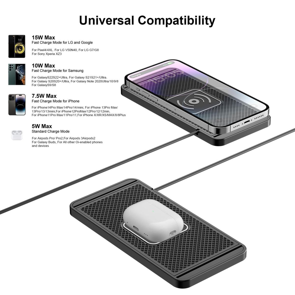 Our wireless car charger pad is also case-friendly, capable of charging through cases up to 7mm thick. with multiple charging modes 15w/10w/7.5w/5w, it automatically adjusts to match your phone's charging speed. .