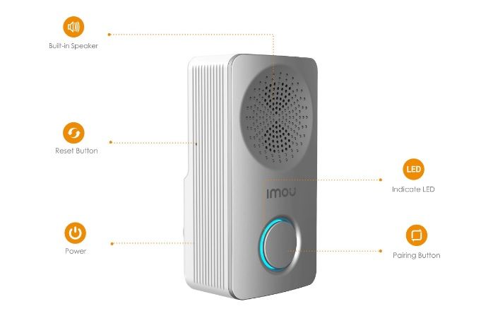 Chime is an indoor Wi-Fi doorbell that replaces the mechanical or electronic doorbell, which can be connected to your home Wi-Fi network and to your Imou video entryphone. When visitors press the bell call button, the bell will ring.Technical Specification Model DS11 Audio Audio Output Built-in Loudspeaker Ring Tone Mutiple ring tones optional( setting on APP) Operation Mode Reset/WPS Button 1 Indicator Light 1 Network Wi-Fi IEEE802.11b/g/n General Installation Surface Voltage 90-240Vac Working Temperature -10°C~+50°C Relatibe Humidity 20%~95%RH Dimensions 99.0mmx52mmx33.7mm Weight 0.3K