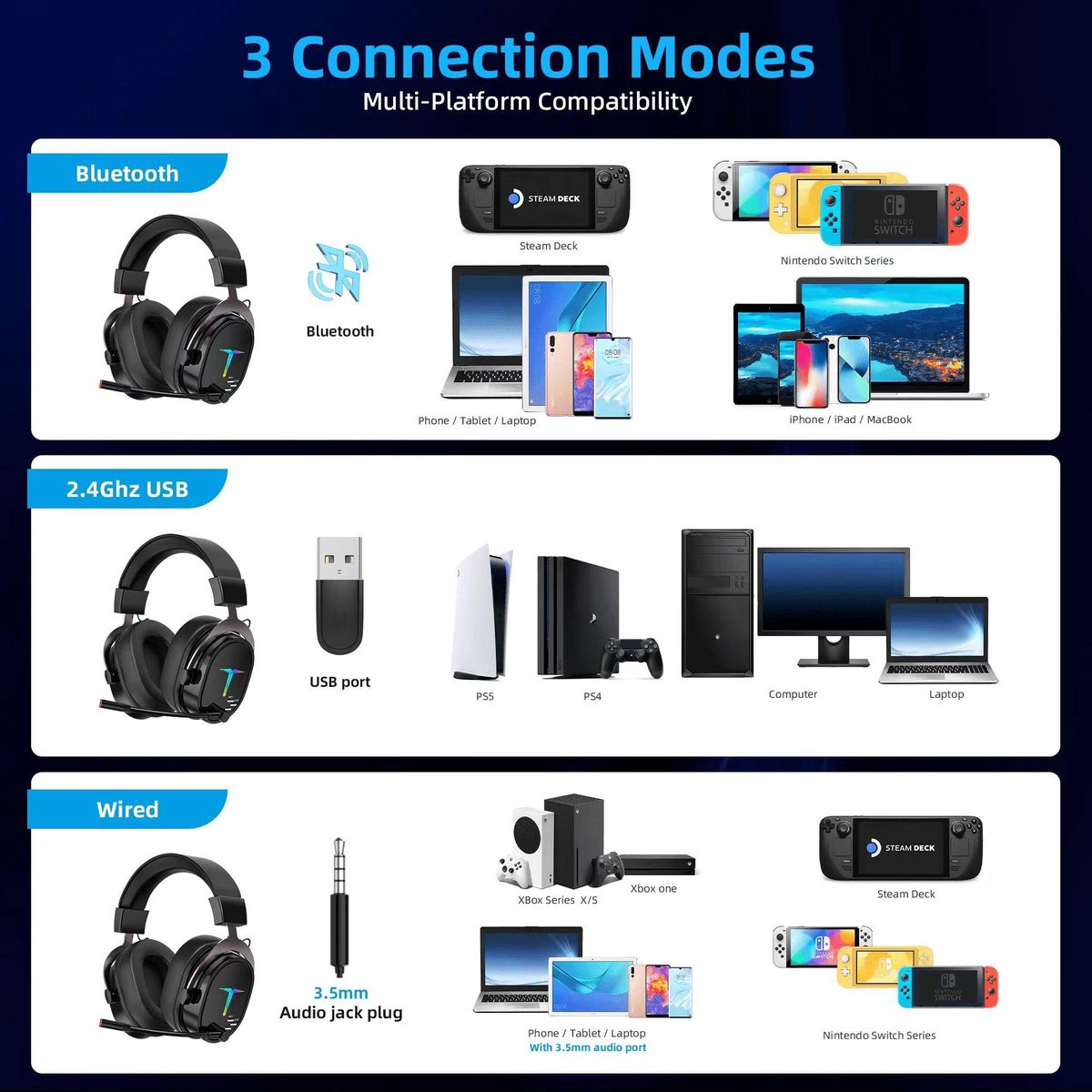 Bluetooth mode is suitable for Android/ios mobile phones, tablets, laptops, switches, steam decks and other Bluetooth devices;