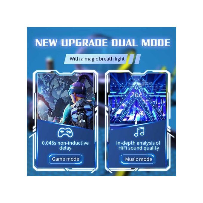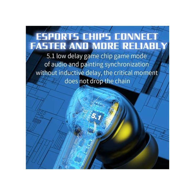 Detailed descriptionDual ModesThis Bluetooth Wireless earbuds have 2 modes, in the Game mode, the earbuds can provide 0.06s ultra-low latency, 3D stereo gaming sound quality; in the music mode, an immersive sound experience can be offered for your enjoyment.• Ultra-Low Latency & 360° STEREOThis earbuds are only 0.06s near-zero delay, which allows you to transmit the sound in gaming to ears in real-time. It makes more detailed sounds of gunshots, footsteps, and explosion be heard than other earbuds, ideal for playing STG games like PUBG, Call of Duty and FORTNITE, etc.• HIFI Sound QualityUse 12mm speakers for in-depth sound quality analysis, which can be matched with polyer biological vibrations and can output high-quality sound.• Stylish and comfortable to wearThis T WS gaming headphones glaring LED lights designed on the earbuds to highlight game atmosphere. Easy to wear for a long time because every surface that touches your ear is made of soft silicone. Just enjoy your game moment!• Touch Control and Auto-PairingThe gaming earphones multi-functional touch control enables playback, volume, phone calls, audio mode control, or Siri activation. Auto pairing technology ensures an automatic connection to the last paired device when picking up the earbuds.