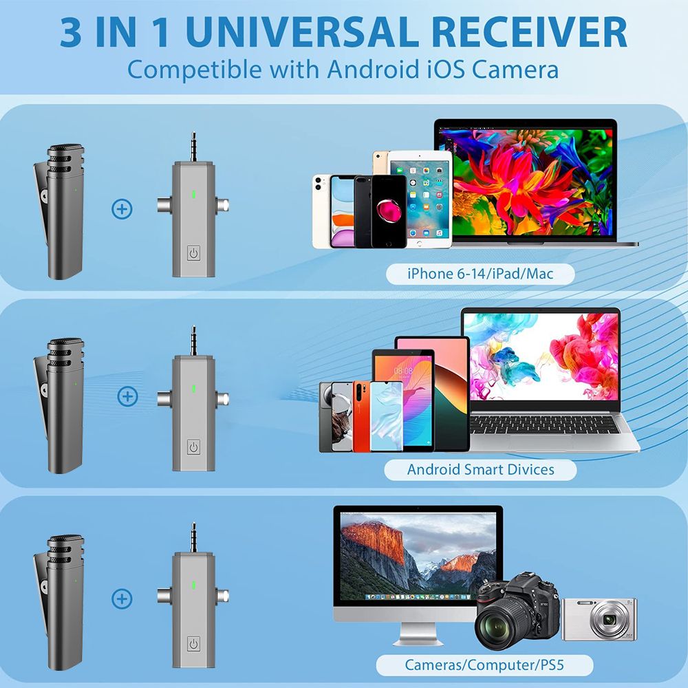 ·【Full Compatibility】The upgraded wireless clip-on microphone is equipped with 3 in 1 universal receiver and a charging Cable. Compatible with iPhone, iPad, PC, Android, Camera etc. Work with IOS 6.0 system or above with (Lightning), Android 3.0 system or above, can be use with iPhone, Android, Camera etc.the handheld mic is suitable for interviewing, online conferencing, podcasting, vlogging, live streaming.
