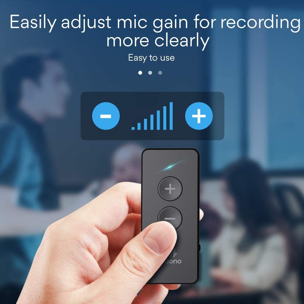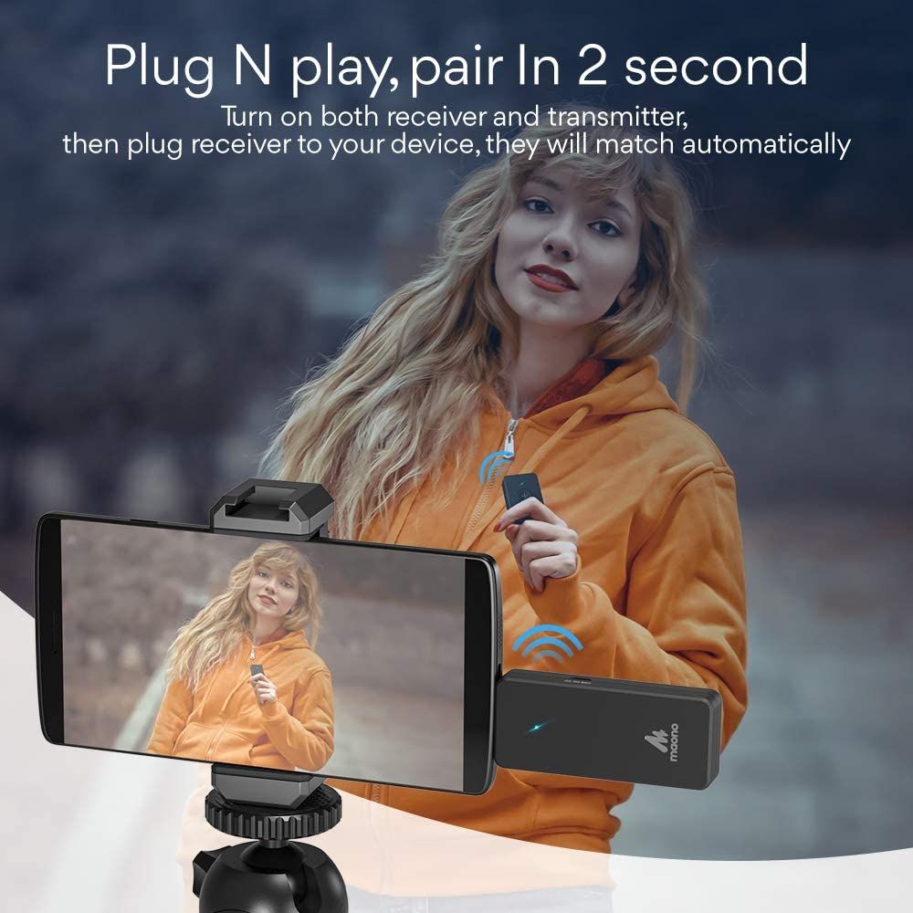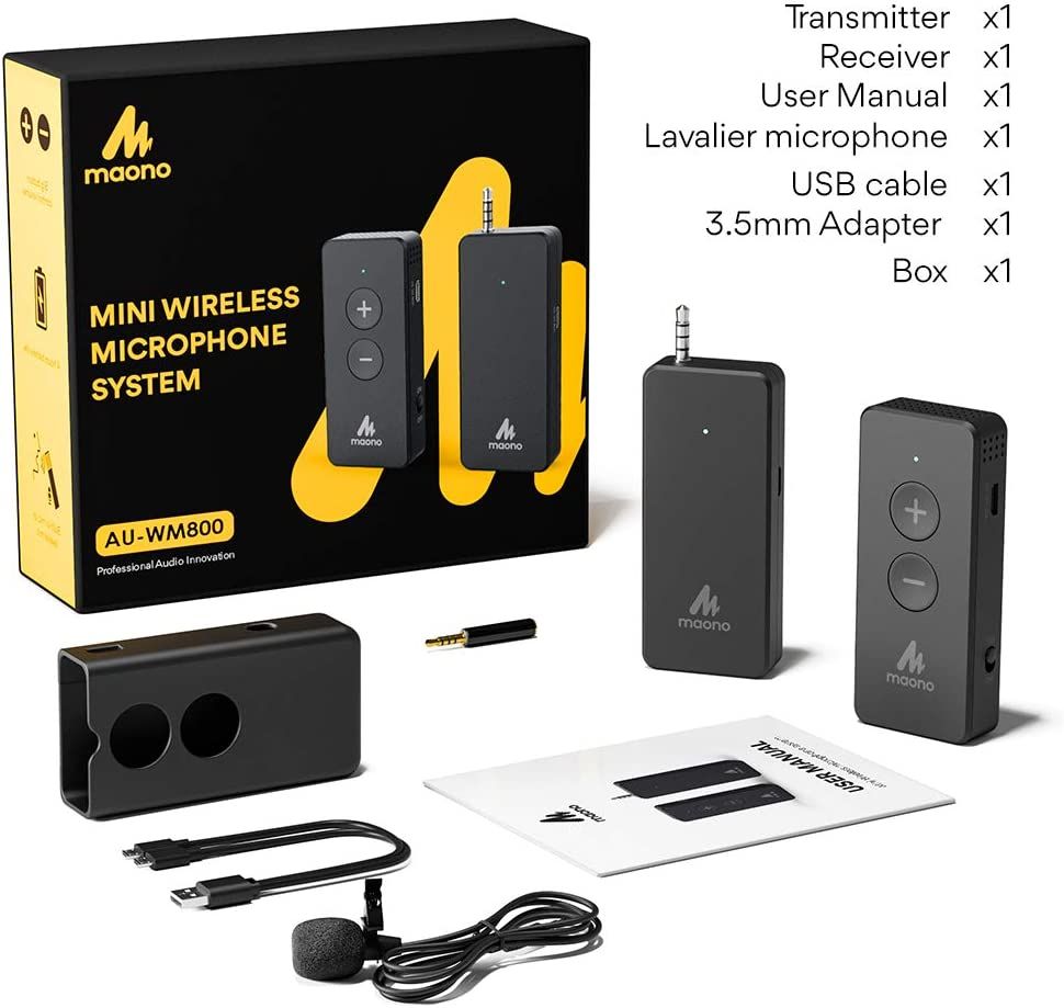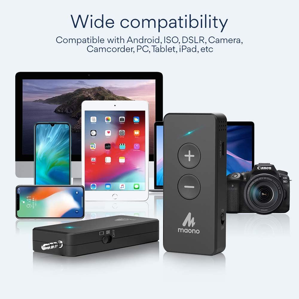 - Intelligent noise cancellation: Automatically identify noise and optimize the original sound. MAONO AU-WM800 wireless mic comes with microphone gain adjust button to satisfy outdoor and indoor recording needs. Works with smartphones, cameras, PC, etc. Charge for two hours and lasts up to 6 hours